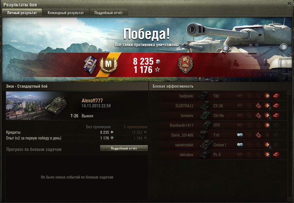 А вот позавчера, мне понравилось..... первого "Колобанова"  взял (остался один против 8 и всех положил.... хотя не все у них олени были (по 5к-10к боёв имели...)), и что ещё приятней, именно на Т 26.