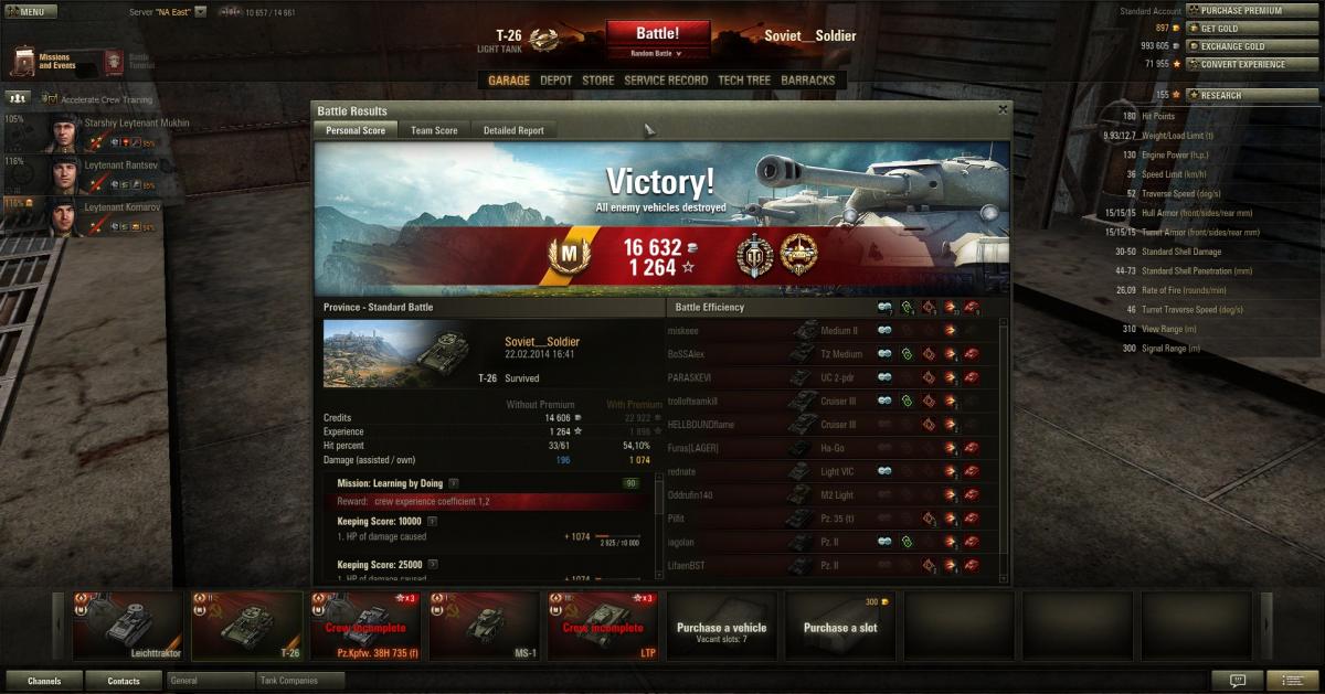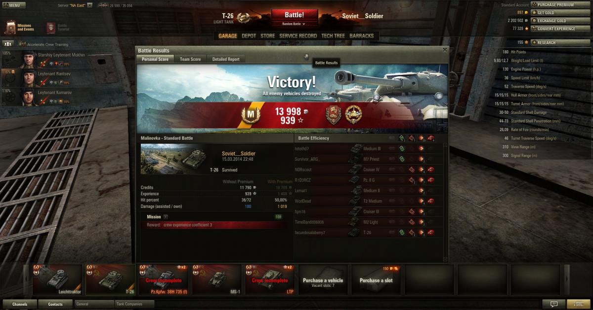 Хороший надежный танк. Вообще в ветке СССР 2-го уровня я не до конца смог скурить только БТ-2, и Т-60 и Т-26 есть в ангаре и регулярно меня радуют. Пулеметчиками разбирается, это да, так что до последнего сидим наверху или в кустах и не суемся в активные действия.