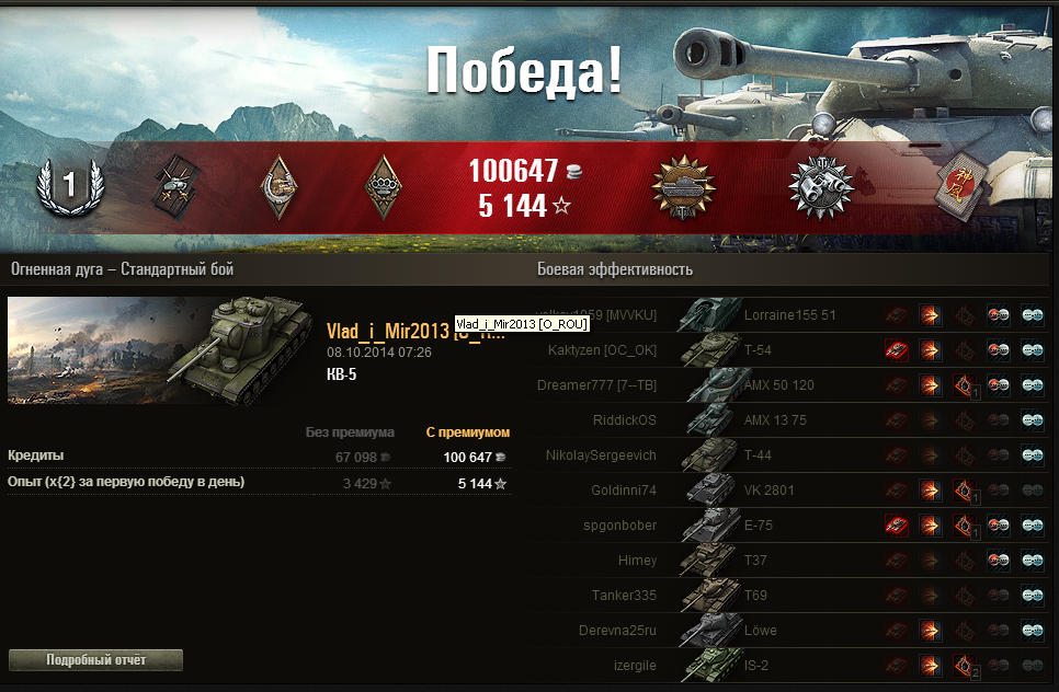 Vlad_i_Mir2013 Опубликовано: 2 декабря, 2014 Игроки 689 публикаций 85 509 боёв Поделиться Опубликовано: 2 декабря, 2014 02 Дек 2014 - 17:46 пользователь 2139 сказал: и как бы не хотелось победить на каком-нибудь Е5 с нижнего респа - кроме как под гору не полезешь. с этого респа на ней вообще боль. в итоге только отстрел "светляков" и пострелушки из-за спин. про сараи типа КВ-4 против 9-10лвл, которым по боку на их броню, вообще молчу. На счет КВ-4 не скажу, давно его проходил. А вот КВ-5 иногда выкатываю. Что делать на КВ-5 против девяток с нижнего респа? Конечно ехать светить аллею, разведчик и дозорный Ваш. реплей из 9.3http://wotreplays.ru/site/3856257#ognennaya_duga-vlad_i_mir2013-kv-5 Вполне стандартная тактика для КВ-5 на Прохоровке и Огненной дуге (если танк прокачан с экипажом прокачан на свет).Дозорные и разведчики все, же на КВ-5 редкость, зато Целеуказатель довольно частое достижение. В проекты WG играю бесплатно. Спасибо за марафон на Е-25 и "Тайного Деда Мороза". Коротко о звуках: завел газонокосилку, выстрелил из духовушки, непробил кастрюлю. Ссылка на комментарий