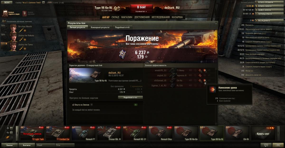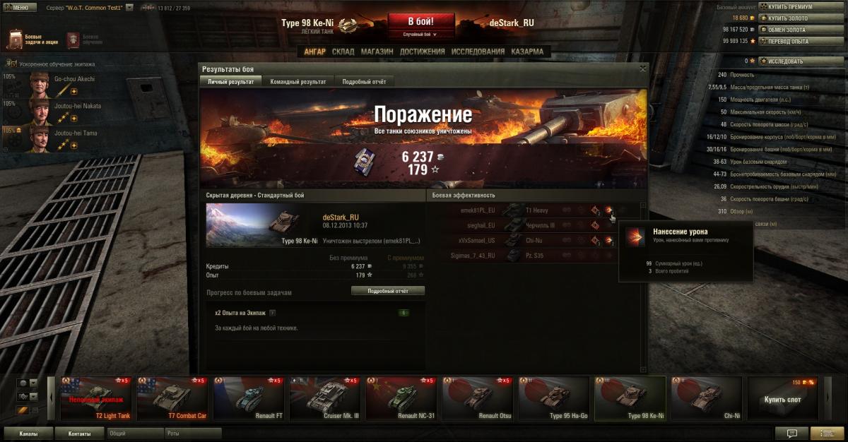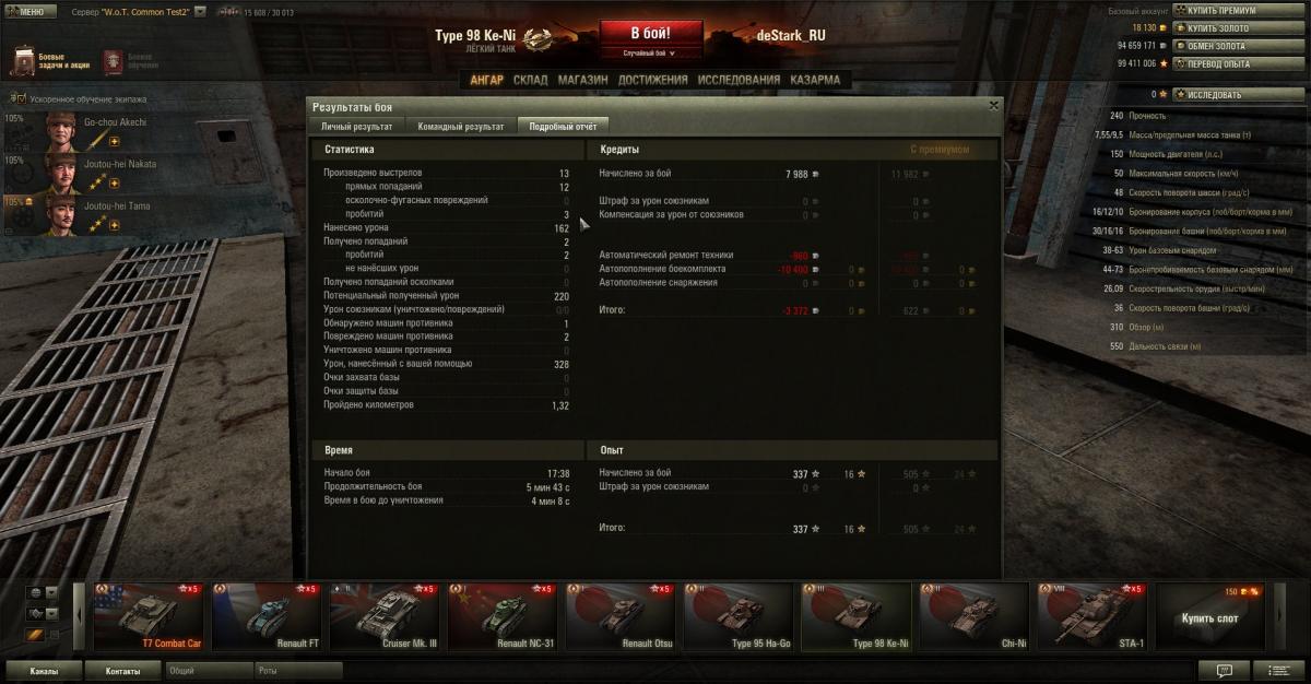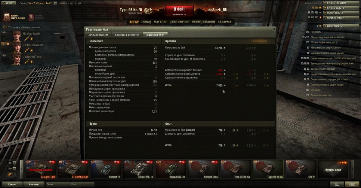 В случае, если решили изучить за свободный опыт, минуя ненужные модули на предыдущем танке - ваш Type 98 Ke-ni будет абсолютно стоковым. Если же изучили все доступные модули на Ha-Go, то сможем поставить предтоповую рацию Type 96 Mk. 4 Bo и предтоповый двигатель Mitsubishi A6120VDe S, при чем на стоковую ходовую.