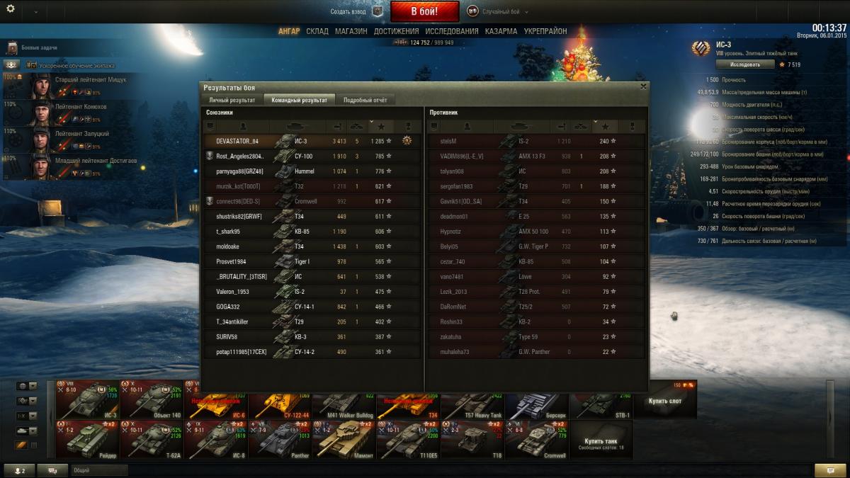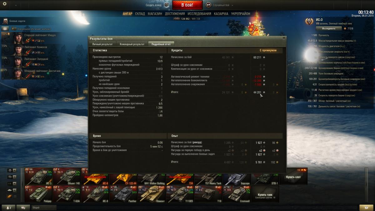Я нуб, стата 48,63% и чуть более 7200 боев. На данный момент ИС-3 мой самый результативный танк (52 % побед). Экипаж пока 2 перка, ББ и ремонт. Оборудование досыл, вентиль, стаб.