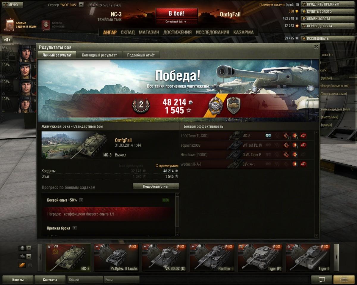Ну и закончился бой тем, что не повезло получить медаль Бруно - низатащил уже мой ИС-3, обидно оставив Гв-тигру Порше 8 хп. Спасибо Су-14, приехавшей прямо под мой ствол, Бийот - тоже здорово)
