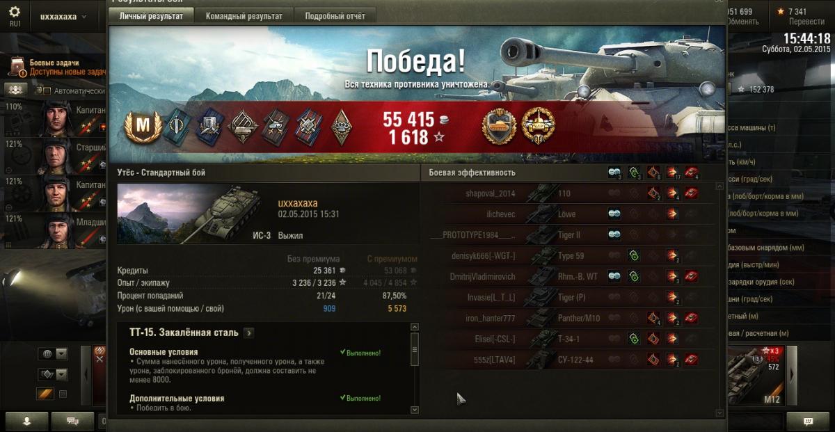 ТТ 15, калибр и 5 последних фугасов. 5,5 к дамаги.http://cdn-frm-eu.wargaming.net/wot/ru/uploads/monthly_05_2015/post-17098513-0-11836200-1430572241_thumb.jpg