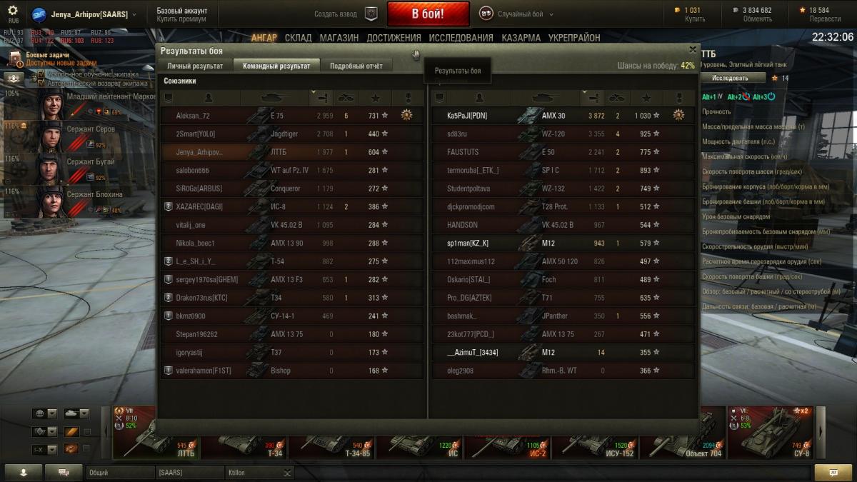 Боевое братство всем, командиру - ремонт, лампочку и эксперта. Мехводу, кроме ББ - ремонт, виртуоза и огнетух. Наводчику - ремонт, мастер-оружейник, огнетух. Заряжающему - бесконтактную БК, ремонт и огнетух. Не обязательно в этом порядке. Просто пришел к такому раскладу на свои 4 перка. Около 700 боев катал без лампы. Поставил - не понял, *** она нужна танку прорыва? Иногда помогает, правда. Все перки заточены под ДПМ и зарубу в ближнем бою. Эксперт у командира помогает не тратить аптечку на мехвода, а голдовая аптечка уменьшает вероятность контузии членов экипажа. Мастер-оружейник - не ремонтирую критованное орудие, так как на дистанции 100-200 метров и так нормально, со стабом и этим перком. Перезаряд -10.98 сек. Не юзаю доппаек, а то можно и быстрее. За счет виртуоза, ББ и вентиля обгоняю всех Исов-3 на поворотах и на дальняк. После апа брони - огонь танк!!! Вторую звезду на ствол поставил (это мой потолок, третью не смогу). Немного сумбурно, но подбор перков - оптимальный по мне. Изменено пользователем Akex_psih