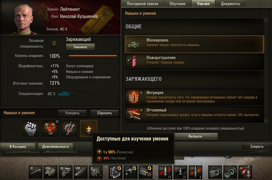 Командир - ББ, Лампа, Ремонт, дальше на выбор - Радиоперехват или Мастер на все руки, предпочтительней на мой выбор именно для ИС-3 - Мастер, так как мехвод критуется через НЛД и бывает по 2 раза за бой.