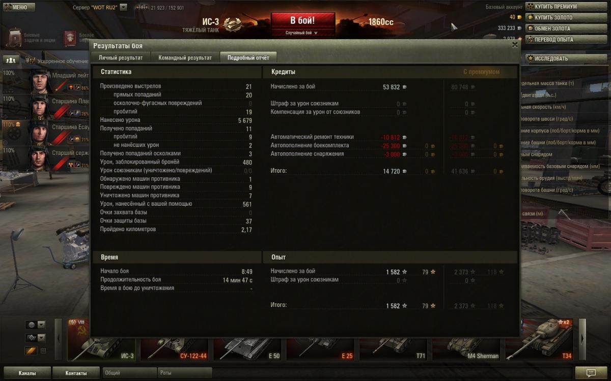 Кстати продолжаю знакомиться с ИС3, сегдня откатал 14 боёв. И в отличии от вчера ни разу не горел, но БК выбивали 6! раз, буду снова менять тактику :) рикошеты по мне приятно радовали(полезные моды по урону).