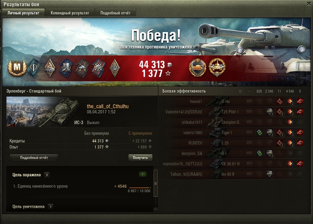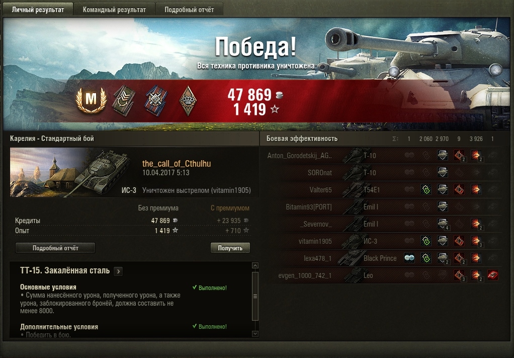 Бой в сущности ни чем не примечателен, рядовой мастер - http://wotreplays.ru/site/9928789#promzona-xellov-is-3 .Немного пришлось постараться, потому как в первой половине боя наша команда благородно захотела уступить победу красным, но ни на какой скилл естественно не претендую. Однако подобное удовольствие и расслабленность после его окончания я уже давно не испытывал. И не смотря на общую инфляцию игровых характеристик данный агрегат все ещё могёт в комфортный геймплей.