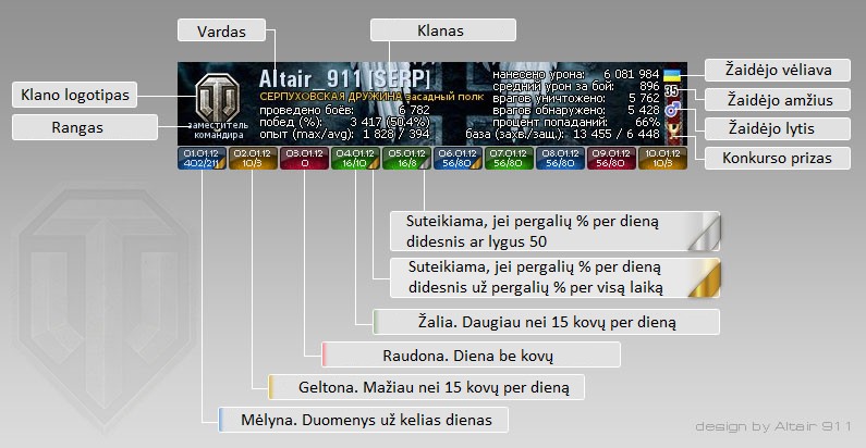 gormonn Опубликовано: 15 марта, 2014 Игроки 67 публикаций 8 510 боёв Поделиться Опубликовано: 15 марта, 2014 (изменено) Добрый день!ПредисловиеНедавно я показал форуму свежий проект Генератор юзербаров.И как часто это бывает, дело, начатое с особым энтузиазмом, рано или поздно выжимает из тебя все вдохновение.Поэтому, что бы не прятать работу от всеобщего обозрения, я решил её выложить, пусть и не в завершенном виде, но вполне функциональном. Друзья, предлагаю Вам стать частью этого проекта.Создайте красивое оформление статистики и данных игрока, и получите 500 золотых:http://s9.uploads.ru/YnX3S.pngИ отдельно, для игроков без клана:http://s8.uploads.ru/Sydhj.png При этом, не стоит ограничиваться текущим расположением элементов и статистических данных.Покажите всем, в каком виде и какую информацию вы хотите увидеть на юзербаре.Вы можете менять все: расположение, начертание, заливка имени, прочих элементов. Будто бы на том месте пустой лист. Ждем от вас интересных решений!(!) И при этом необходимо понимать, что вариантов может быть масса, т.к. я всеми конечностями за полную кастомизацию юзербаров. Это значит, что на сайте будет несколько вариантов оформления, более того, планируется постоянно пополнять их список.(!) Однако стоит учесть, что левую часть изменять не планируется, и основной упор надо делать на правую часть. Однако ничего не запрещает высказывать идеи на этот счет.(!) Принимаются анимированные изображения (gif) - с расчетом на то, что появится возможность создавать юзербары с анимацией. Игроки, чьи работы будут добавлены в сервис, получат в подарок 500 золотых монет.На сайте будет указано авторство.Успехов! Проект открыт для предложений. Уже поощрены:serega_sf (500 зол.) Изменено 23 марта, 2014 пользователем gormonn 2 Интерактивные юзербары Ссылка на комментарий Поделиться на других сайтах Другие способы поделиться...