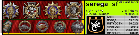 serega_sf Опубликовано: 15 марта, 2014 Игроки 4 321 публикация 47 686 боёв Поделиться Опубликовано: 15 марта, 2014 Нашел в инете сигнатуру, пояснения не на русском, но все и так понятнотам настраивался общий фон сигнатуры, данные по статистике, цветовое исполнение, плюс снизу семафор за последние 10 дней (цвета семафора попробуй перевести пояснения) 3 Ссылка на комментарий Поделиться на других сайтах Другие способы поделиться...