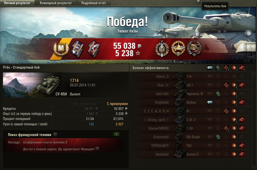 Получено опыта: 5 238 (x3 за первую победу в день)