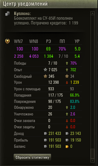 Сравнение с вн7-вн8 дико странное вырисовывается. Видимо я не чемпион мира по захвату/сбитию захвата. Все бои соло рандом, только на СУ-85И. Как всегда без голд снарядов и расходников. Фарм получился низкий, потому как в лом платить за прем аккаунт.