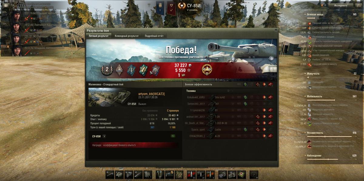 Реплей: http://wotreplays.ru/site/10673119#malinovka-artyom_ktk-su-85i