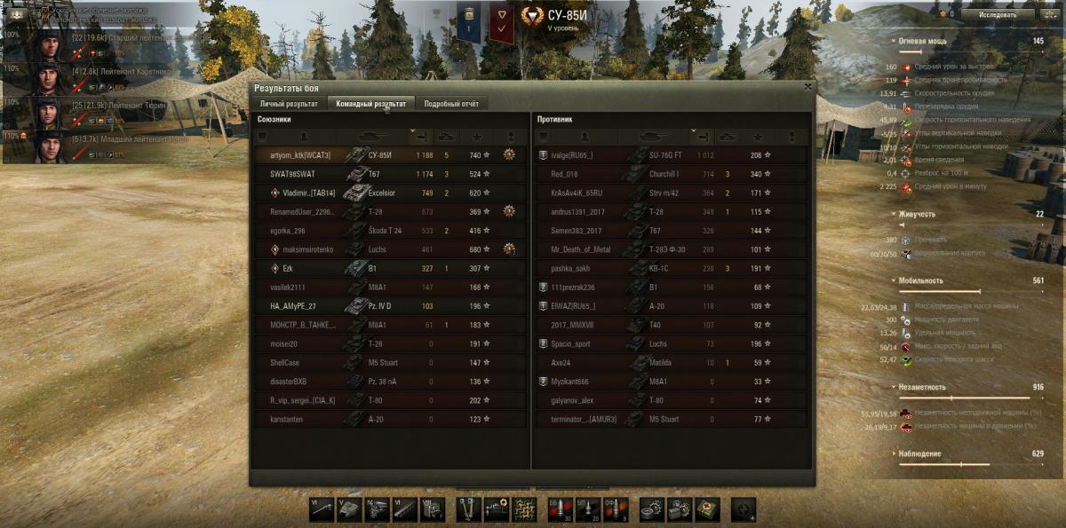 СУ-85И — забавный аппарат. Очень не хватает мощности двигателя — подъем в гору иногда становится просто мучительно долгим. Линейная СУ-85 мне пока кажется более комфортной, но и от СУ-85И нет негатива, те же недостатки характерны и для других советских ПТ, которые есть в ангаре. Экипаж общий на три машины — СУ-85, СУ-85И и СУ-122-44.