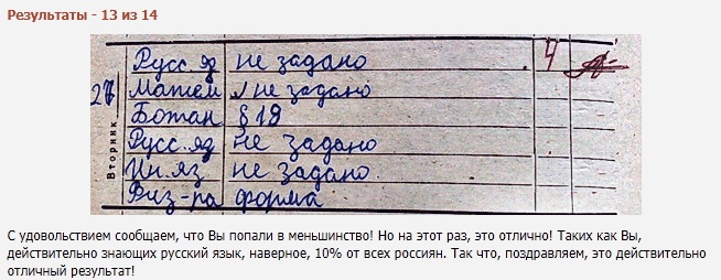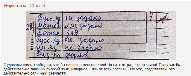 С удовольствием сообщаем, что Вы попали в меньшинство! Но на этот раз, это отлично! Таких как Вы, действительно знающих русский язык, наверное, 10% от всех россиян. Так что, поздравляем, это действительно отличный результат!