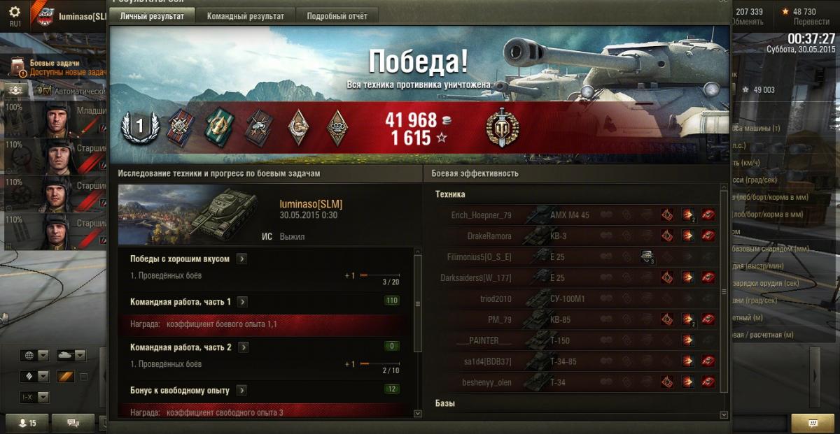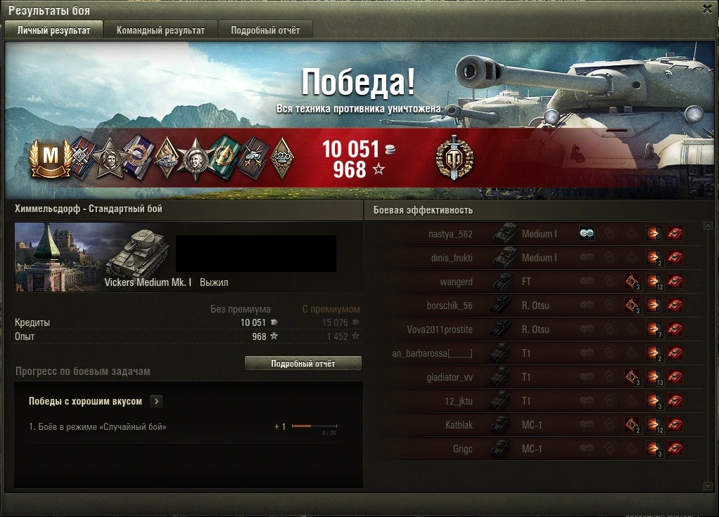 o_oDiAnAo_o Опубликовано: 29 мая, 2015 Игроки 3 909 публикаций 58 232 боя Поделиться Опубликовано: 29 мая, 2015 ой я тож похвастуюсь тутвот, тож затащил на тт, на стоковой пушке , почти в одиночку держа фланг ( с помощью тигра 2 -его успехи отражены в послебоевой) , и без всяких взводов. http://cdn-frm-eu.wargaming.net/4.3/style_emoticons/wot/Smile-tongue.gif а щас добью опыт на топовую пуху и заживем http://cdn-frm-eu.wargaming.net/4.3/style_emoticons/wot/Smile_smile.gif 1 .на чужой кавай тентакли не распускай!Со мной бесполезно спорить. Я выскажу свою мнение и убегу, а ты останешься и будешь выглядеть нелепо ^____^ Ссылка на комментарий