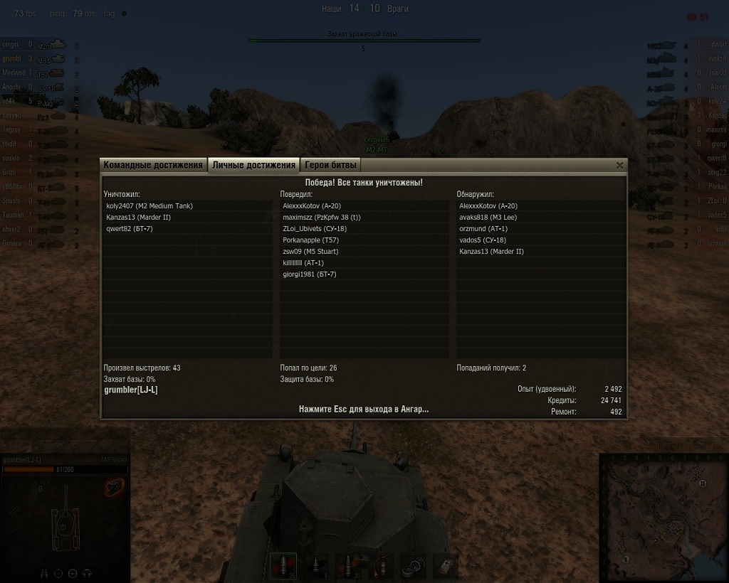siguran Опубликовано: 9 августа, 2011 Игроки 48 публикаций 9 026 боёв Жалоба Поделиться Опубликовано: 9 августа, 2011 Победа!Бой: Песчаная река 10 августа 2011 г. 1:32:27Танк: КВ-5Получено опыта: 2 580Получено кредитов: 163 414Достижения в бою: «Стальная cтена», «Снайпер» Пруф:http://picsearch.ru/share/thumb-C0EA_4E41943E.jpg http://picsearch.ru/share/thumb-5902_4E4193E0.jpg Когда ВБР благосклонен... Любую проблему можно решить тремя способами: правильно, неправильно и по-армейски. Ссылка на комментарий Поделиться на других сайтах Другие способы поделиться...