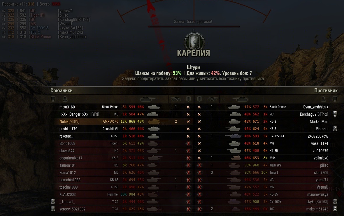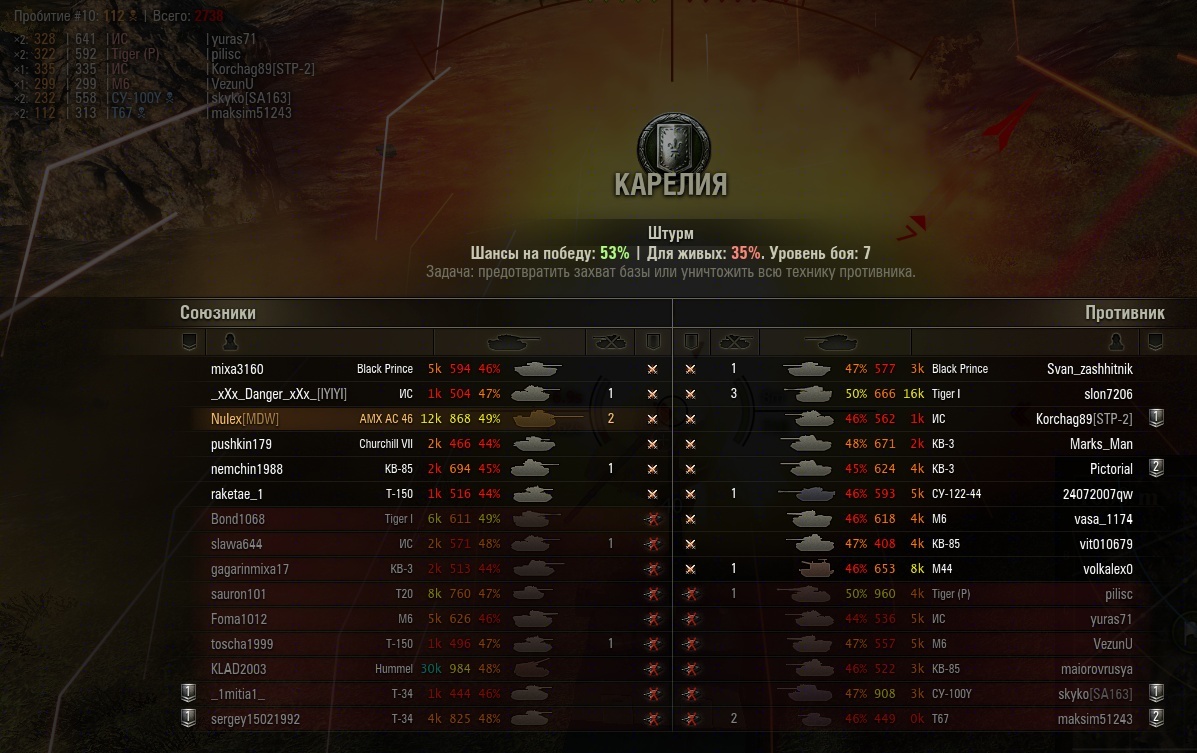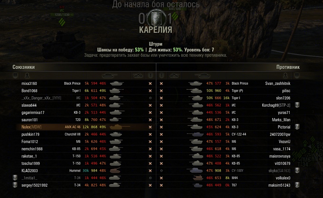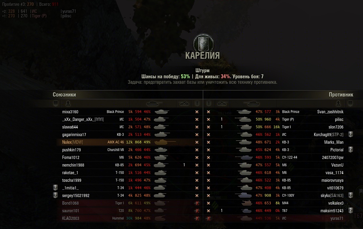 Итак бой штурм, защита, Карелия, шанс на победу аж 53%. По 2 желтеньких на команду, остальные красно-оранжевые. С учетом искусственного расширения оленемером диапазона шансов на победу можно принять шанс равным 52%, почти идеальный баланс.