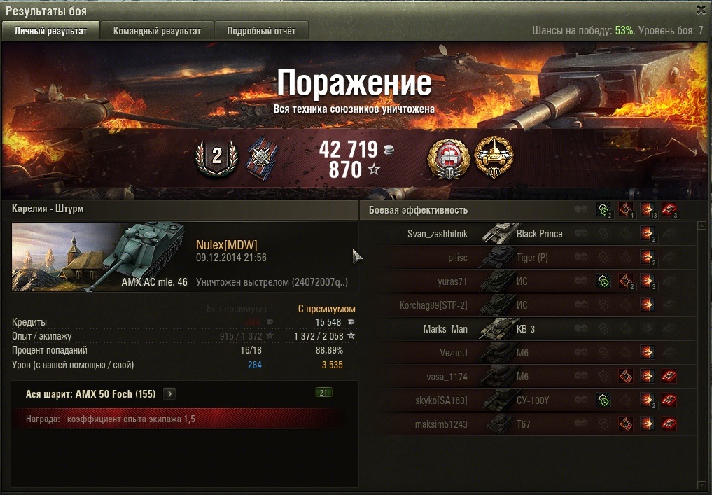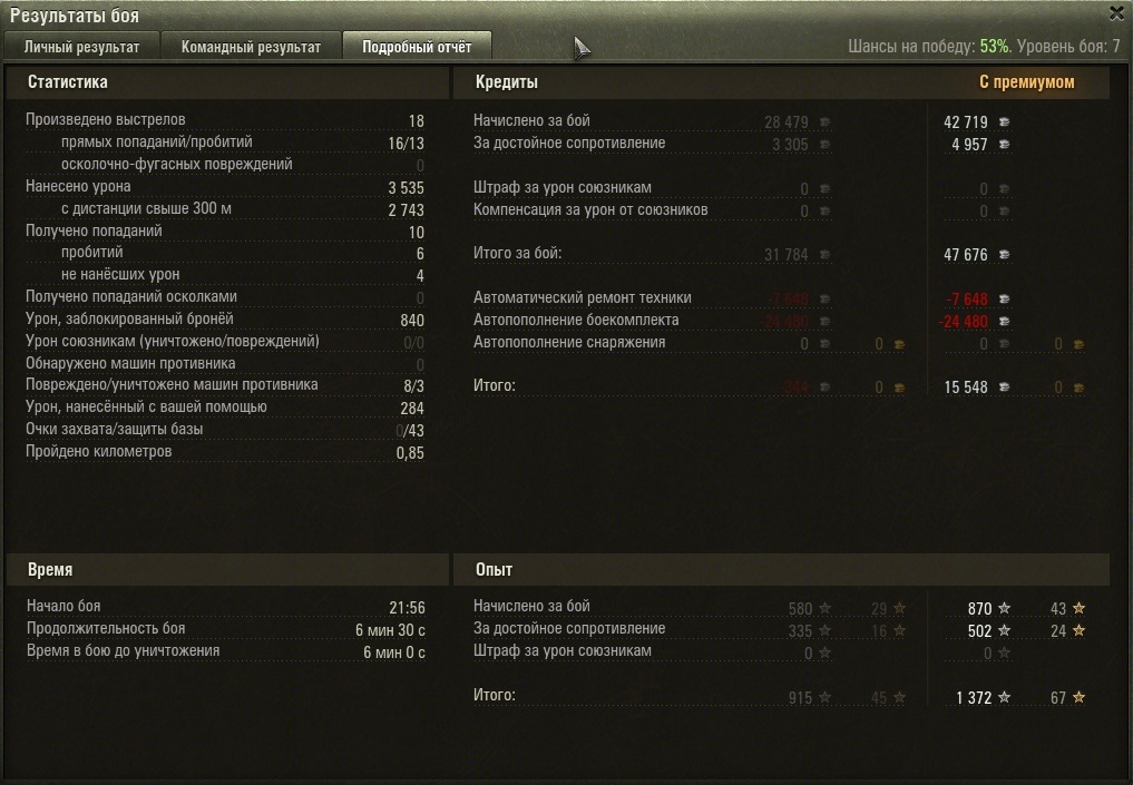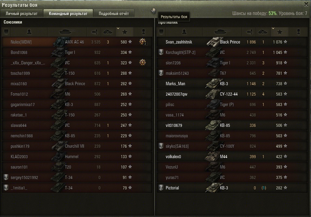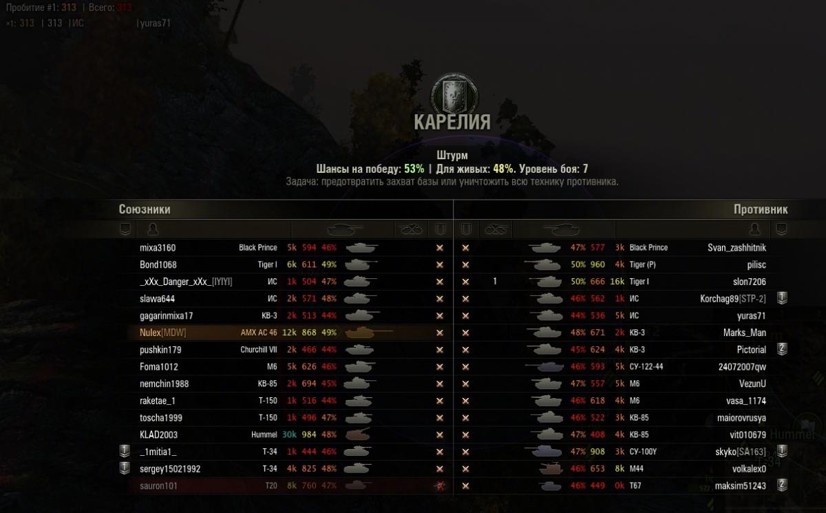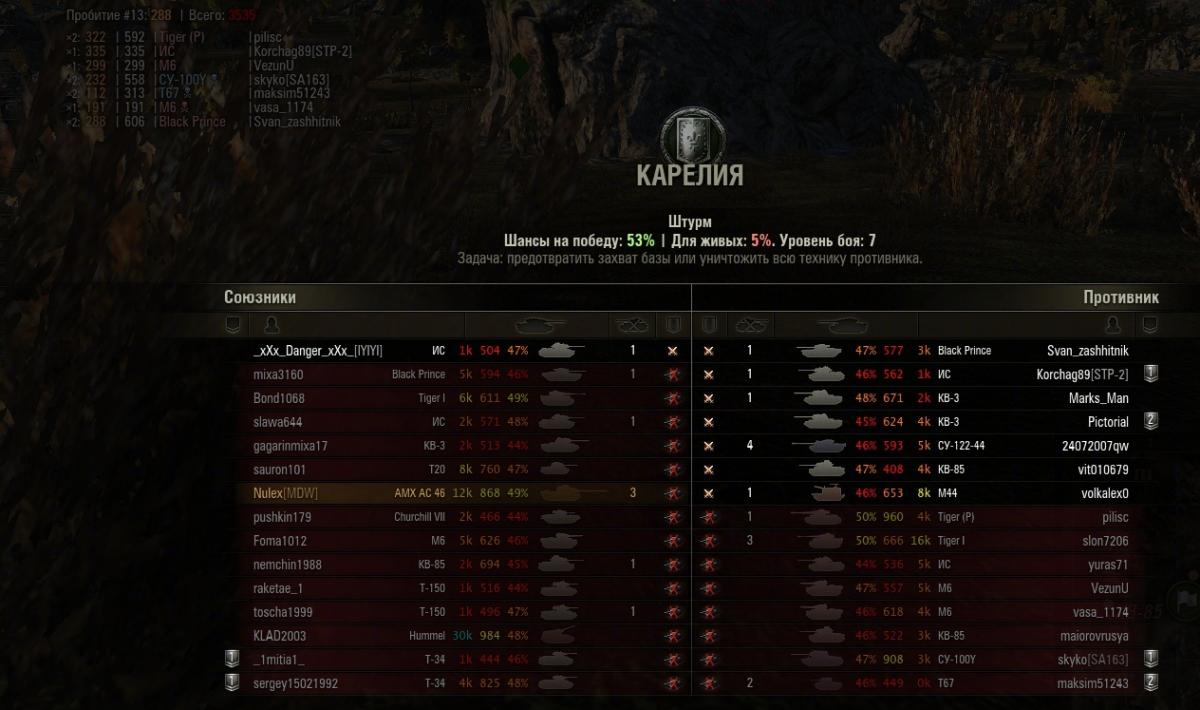Итак бой штурм, защита, Карелия, шанс на победу аж 53%. По 2 желтеньких на команду, остальные красно-оранжевые. С учетом искусственного расширения оленемером диапазона шансов на победу можно принять шанс равным 52%, почти идеальный баланс.