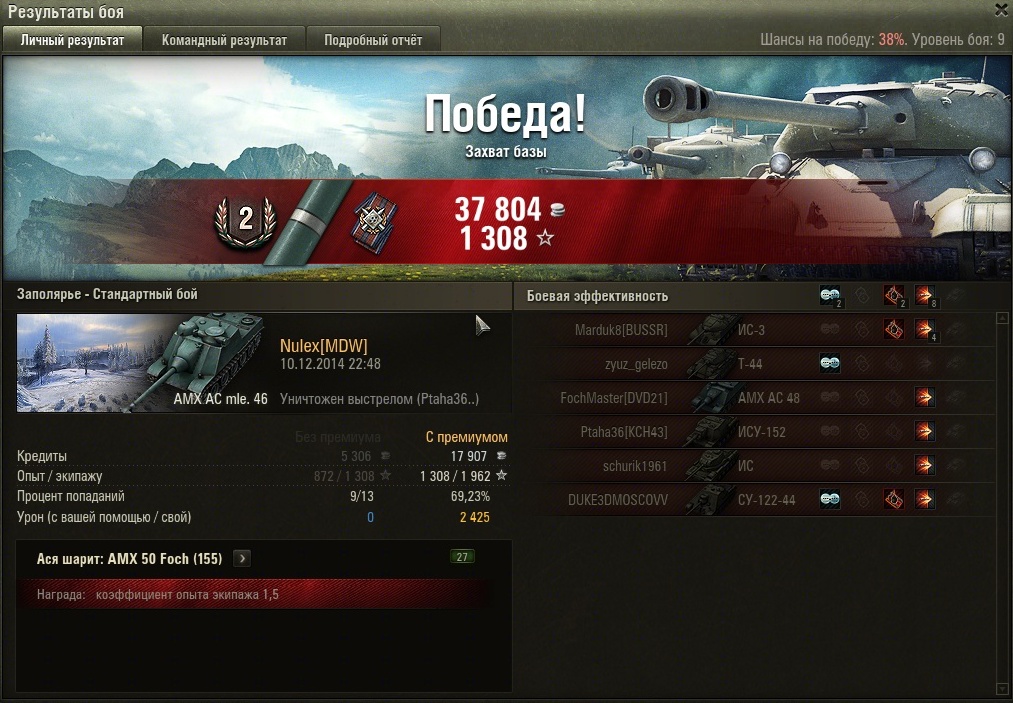Но в меня тоже стреляли, хотя француз и неплохо танкует на своем уровне, но в противостоянии снаряд-броня, рано или поздно побеждает снаряд. И после еще 2 выстрелов и одного фрага мои ХП подходят к концу и команда теряет всякие шансы на победу.