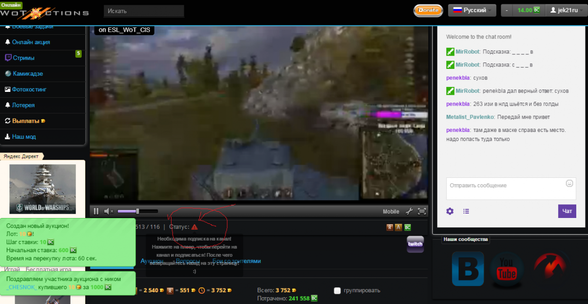 jek21ru Опубликовано: 3 мая, 2016 Игроки 1 публикация 45 356 боёв Поделиться Опубликовано: 3 мая, 2016 (изменено) вс.пр. у меня проблема не получается регистрация на канал хотя я уже подписался" twitch" решите пожалуйста ваше!!! Изменено 3 мая, 2016 пользователем Alextt72 Ссылка на комментарий Поделиться на других сайтах Другие способы поделиться...