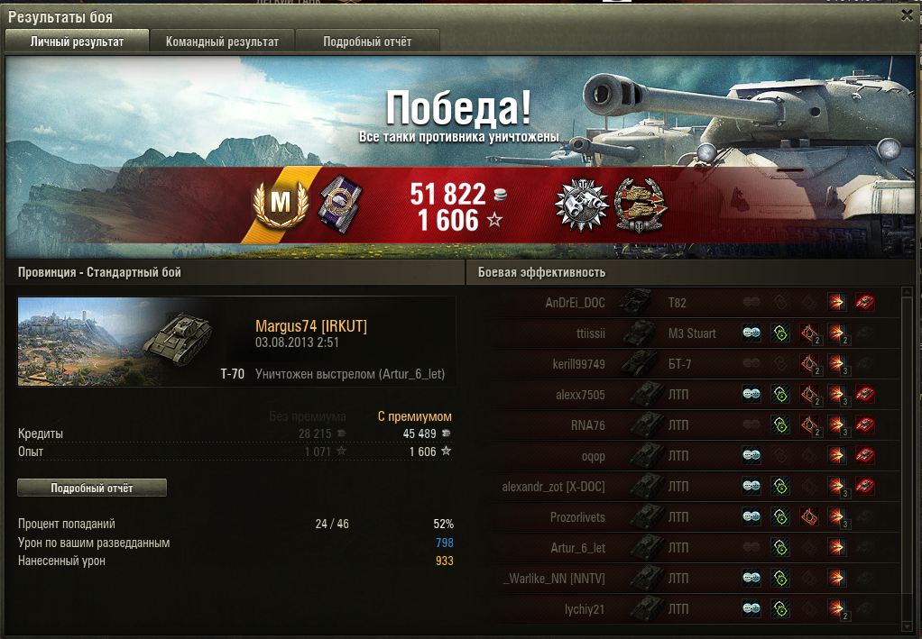 Сегодня,после очередной серии необъяснимых и просто нереальных сливов,когда у врага почему-то все адекватны,а в той,команде,куда меня кидает,все хотят сдохнуть даже не выстрелив,я продал этот замечательный танк.Т-70 не был виноват в том,что мне не нравится получать удовольствие от того,что вся команда не хочет победить в бою,но я заметил,что есть танки,которые тупо кидает бой за боем на дно к ракам (недавно по очереди играл на брит.арте-Секстоне 1 иСекстоне 2,так Секстон 2 80% кидало к адекватам,Секстон 1 80% к отбросам,при этом руки одни и те же и ТТХ арт максимально похожи,почти неразличимы),и это не изменишь.Танк может нравиться,вы можете выжимать из него всё возможное,пытаться-но...бой за боем у вас не будет шансов.Такие танки нужно продавать.Смотрите самиhttp://4put.ru/pictures/small/758/2330280.jpg,каждый бой,КАЖДЫЙ!,я уничтожаю 2.5 танка и наношу почти 2.5 урона от своих ХП (при том,что слишком часто с 5 лвл воюю),70% проведённых боёв,где бы я не находился (а этот танк всегда внизу списка :smile: ),я в первой тройке по опыту и часто по урону,и при этом я не могу вырваться из 57%,т.е. на 10 боёв победить всего 6 раз.Вот такая неудача вышла у меня с Т-70,а ведь танк замечательный, этакий закос под амерские ПТ с вращающейся башней.Всем,кто не выбросил этот танк,удачи.