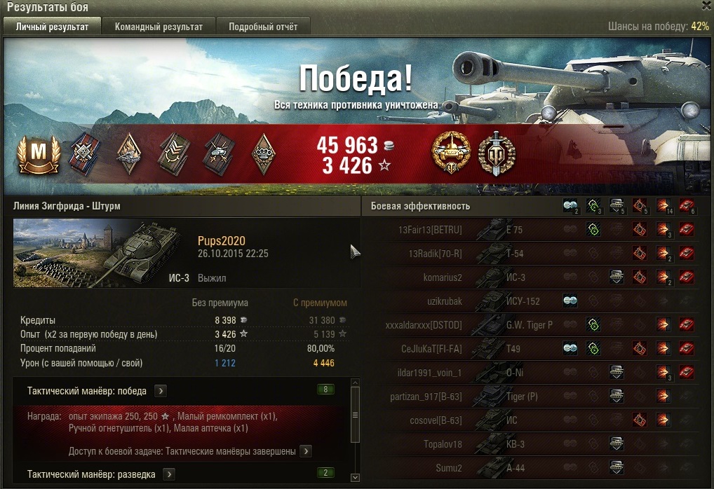 Нравятся углы наводки, можно из-за угла выкатиться не подставляя пулемётные башенки, а морду пробить не могут :) Однозначно оставлю в ангаре, не только как памятник (Штуг после нескольких боёв стоит, не понравился).