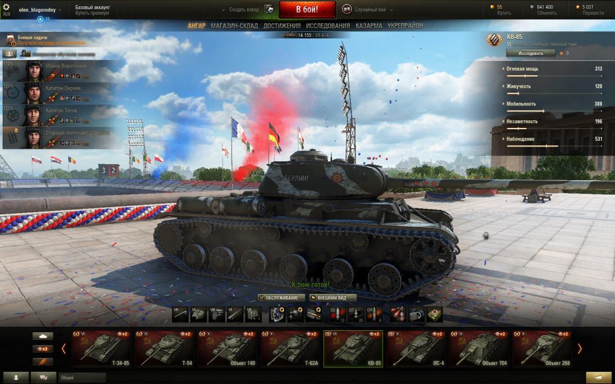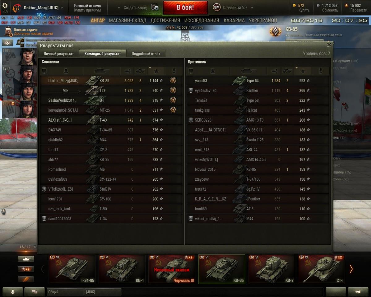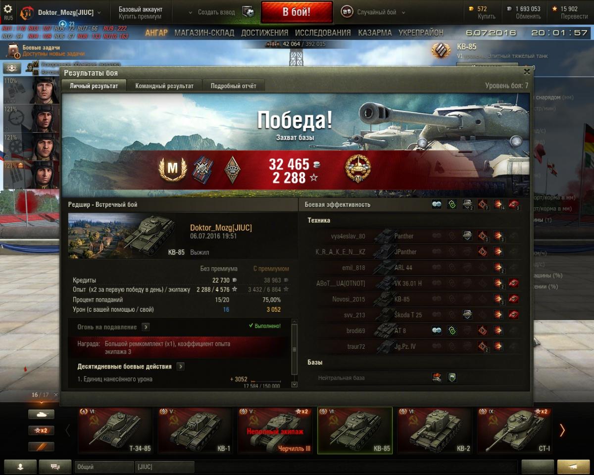 Давно он у меня в ангаре, был в свое время еще пройден Кваскактанк, потом когда его поменяли решил выкупить КВ-85. Ниче так танк оказался, но только с предтоповой пушкой. Боев немало откатано, вроде сотен семь. Поначалу конечно негнущаяся пушка дико бесила, но ниче, если часто катать быстро привыкаешь. Ни упарывался никогда насчет отметок или там дамага,  как-то само сабой 2 звезды прилетело, щас процент в районе 90%, так может и третью возьму)) Экипаж четвертый перк докачивает, что конечно танку помогает. Броней конечно не блещет, зато за счет своей динамики порой успеваешь и подамажить, и по флангам поноситься, и захват и сбить и захватить)) Вот скрины с боя, по всей карте пришлось носиться чтоб бой вытянуть, ну плюс последние живые союзники адекватные попались, иначе был бы слив