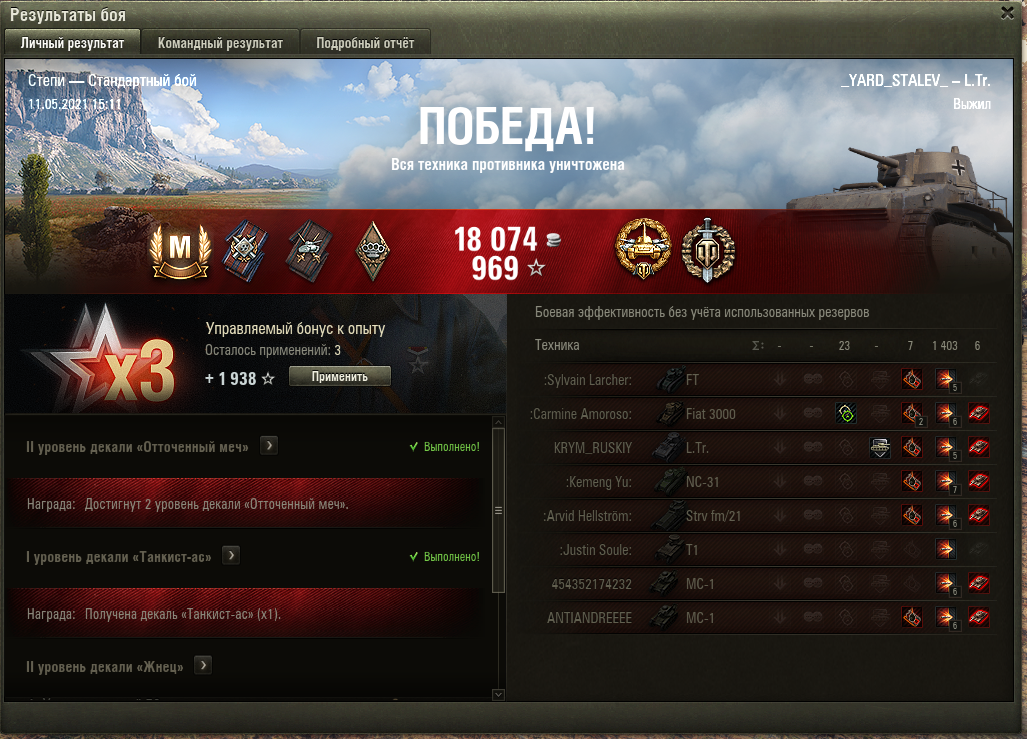 Решил продать этот хлам из ангара, сыграв напоследок, и как раз попался бой с ботами. Удалось ликвидировать вражеского игрока на M2 Light, а дальше осталось расстрелять ботов, что и было сделано.