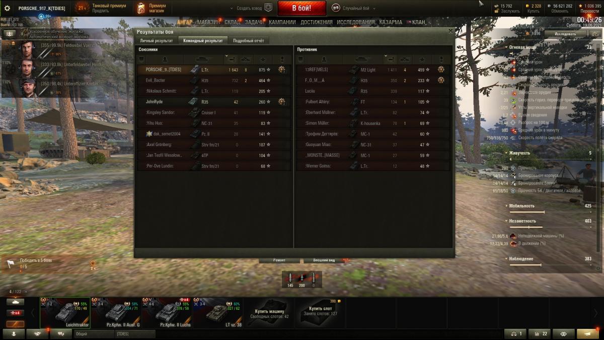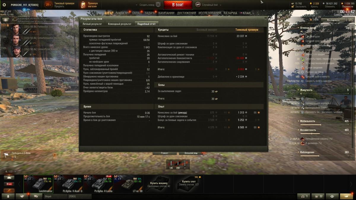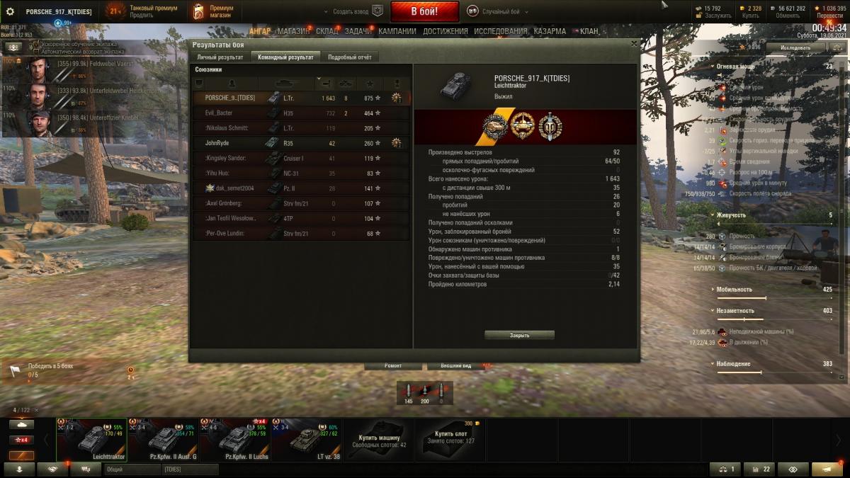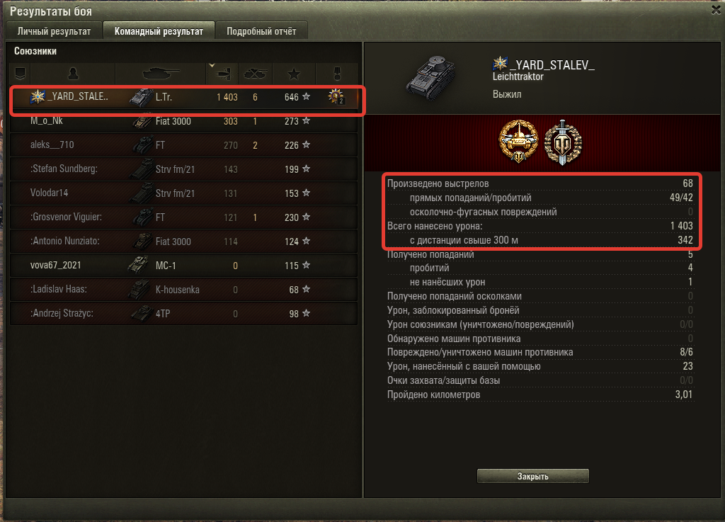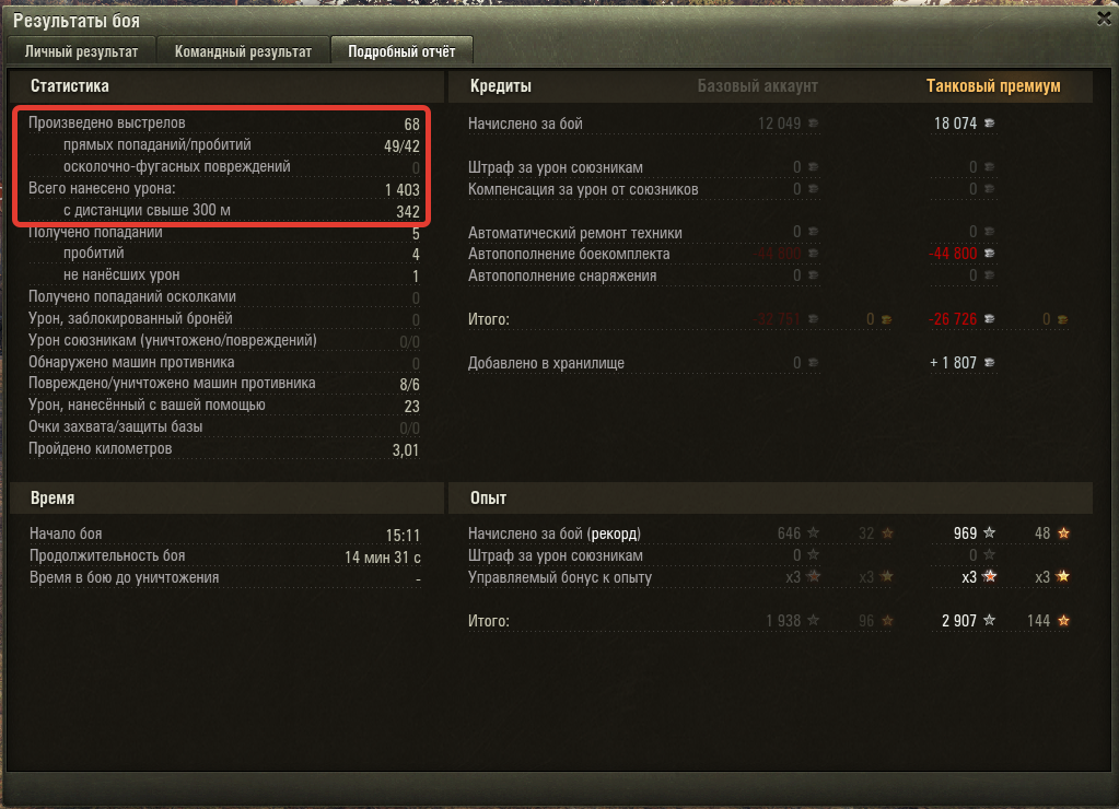 6 фрагов, 1403 урона, 646 опыта.
