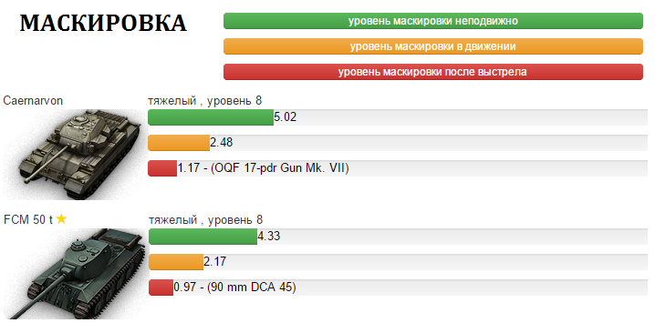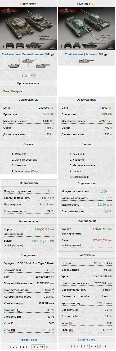 Stanley_Steel Опубликовано: 8 марта, 2015 Игроки 6 202 публикации 37 101 бой Поделиться Опубликовано: 8 марта, 2015 (изменено) 08 Мар 2015 - 22:35 пользователь Raidenru сказал:Доброго времени суток! Решил сравнить, на мой взгляд, самый лучший прем ТТ с далеко не лучшим ТТ 8 лвл. Сравнение ТТХ во вложенных картинках. CaernarvonТяжелый танк, обладающий снайперски точным орудием, с довольно хорошим побитием 226 мм., хорошим базовым обзором в 400 м., приятным -10°увн и относительно большой прочностью 1600 ед. Собственно говоря его плюсы на этом заканчиваются.Бронирования как и динамики у него практически нет, что означает, что он является легкой мишенью для всех танков, в особенности сау, пт с высоким разовым уроном и лт, однако если вам попадется не особо опытный противник, который будет стрелять в ВЛД, есть возможность "вытанковать" какой то урон, но практика показывает, что даже самый глупый противник больше 2х раз не станет стрелять в ВЛД.Попытки "танковать" бортом бесполезны (по правилу трех калибров 51 мм может спасти только от орудий с пробивной способностью до 153 мм). Поймать рикошет на нем скорее удача чем скилл. Маска толщиной всего 200 мм. за ней пустота. Нижний бронелист 76 мм. приведенная броня примерно 120-125 мм., верхний 130 мм примерно 230-240 мм. приведенной.По поводу бронирования хочется еще добавить, что этот ТТ имеет 20% шанс загореться, при попадании в двигатель,а также часто является "ваншотом" для САУ 7го и выше уровней. Боеукладка расположена спереди танка в нижнем бронелисте, что тоже не очень хорошо.Скорострельностью и Уроном в минуту он не блещет. При условии использования вентиляции, боевого братства, досылателя имеем перезарядку 6,44 сек., ДПМ примерно 2143 ед.(Экипаж естественно 100%).В итоге его основным достоинством является его точность, играть на нем в первых линиях не рекомендуется, получается танк поддержки. FCM 50tТяжелый танк, с прекрасной динамикой почти 18,5 лс/т, максимум 51 км/ч, с не плохим побитием 212 мм., хорошим базовым обзором в 400 м., достаточным -8°увн.Так же к достоинствам можно добавить и его урон в минуту, при условии 100% экипажа, использования вентиляции, боевого братства, досылателя получаем перезарядку 6,19 сек., ДПМ примерно 2326 ед.Точность 0,36 вполне себе достаточная для комфортной игры.Благодаря хорошей динамике танк способен тараном наносить колоссальный урон по легким танкам, и танкам с относительно не большой массой. Танк совершенно лишен бронирования, за исключением бортов, "танковать" бортом на нем есть возможность, 80мм как ни как уже достаточно, чтобы, подставляя под правильным углом, отбить выстрел например иса-3го. Не забудем и тот факт, что он является премиумным и имеет льготный уровень боев. Вывод FCM 50t лучше? Не противоречит ли это политике "премиумная техника не должна быть лучше аналогичной прокачиваемой в топ-комплектации"? Или в данном случае имеется ввиду что FCM не превосходит AMX 50 100? Интересно ваше мнение. Каернарвон должен играть через укрытия, от башни. Каернарвон, который пытается соревноваться с ФЦМ50т в динамике или в перестрелке в чистом полу - глупый Каернарвон.Правильный Каернарвон воспользуется холмами, чтобы спрятать жирное слабобронированное тело, и выставит на обозрение врагам только крепкую башню с непробиваемой маской почти во всю морду. Если ФЦМ50т захочет с ним поперестреливаться, то быстро наполучает плюшек в свою гораздо более 