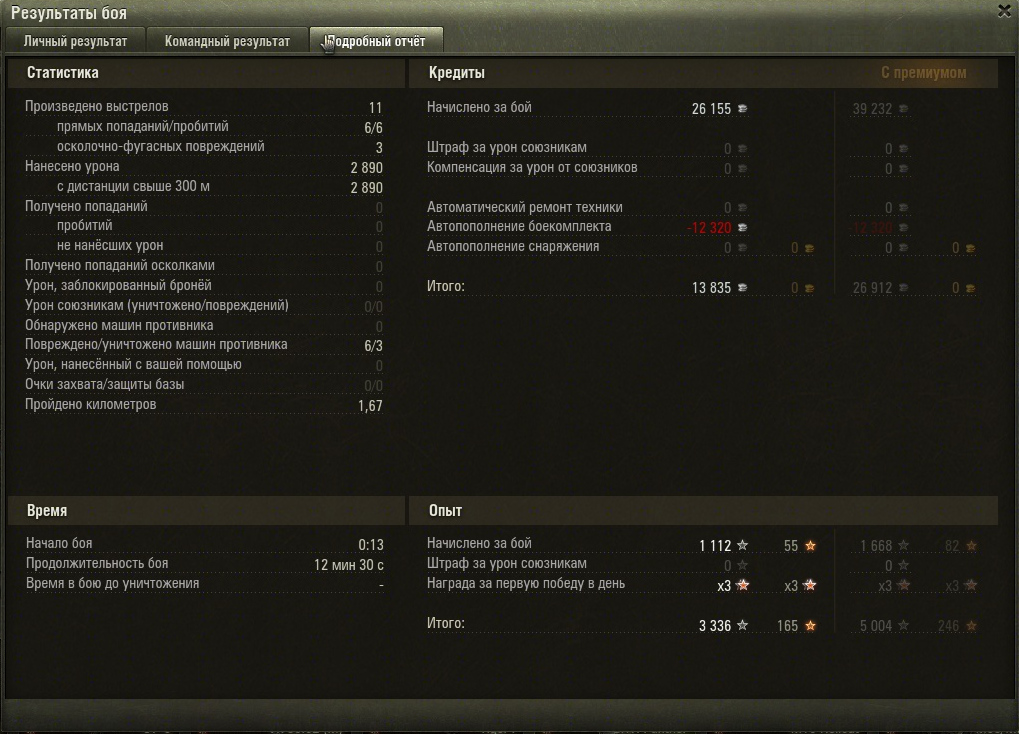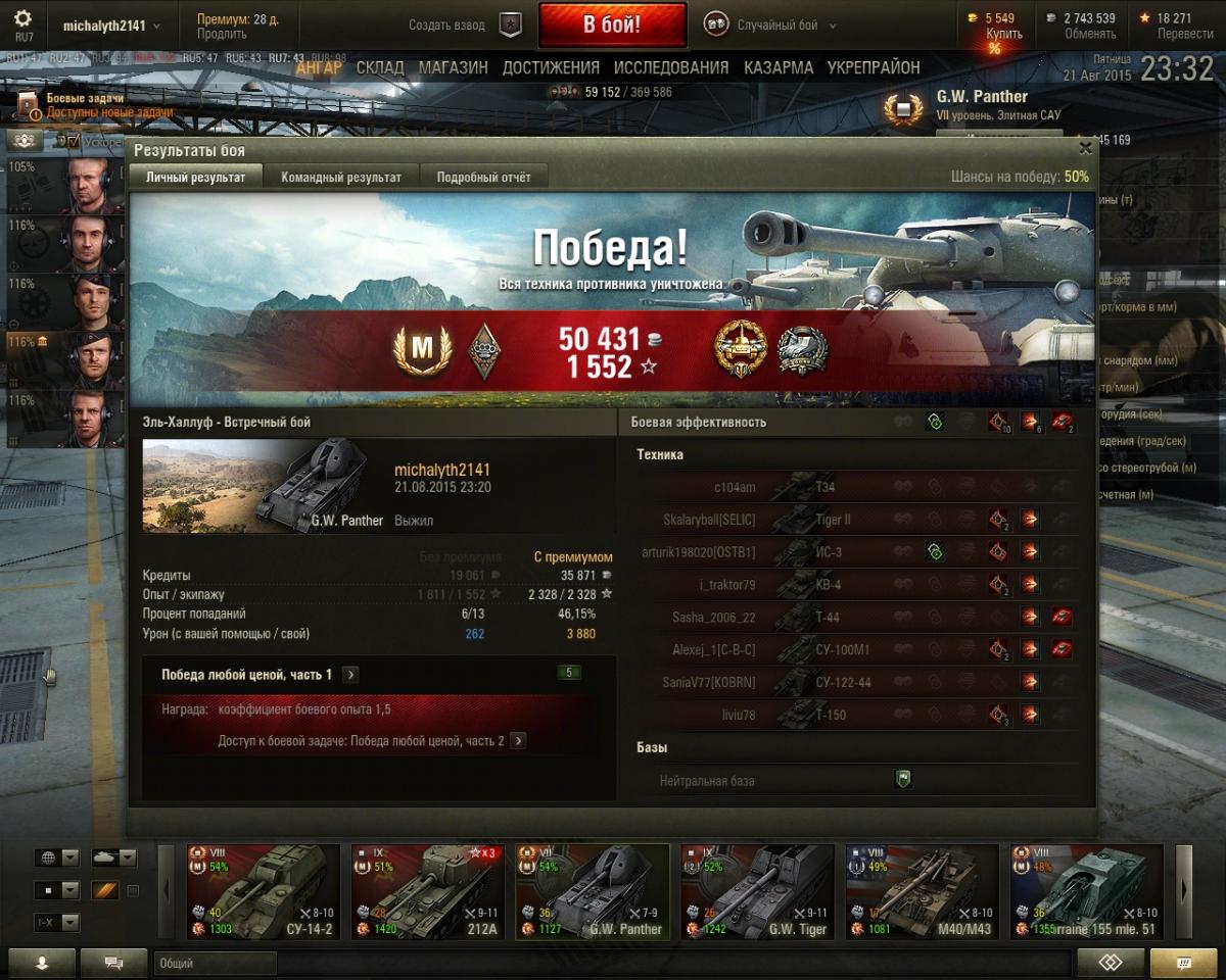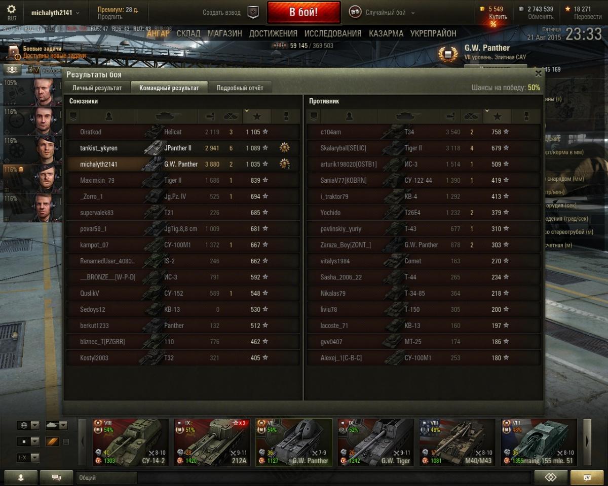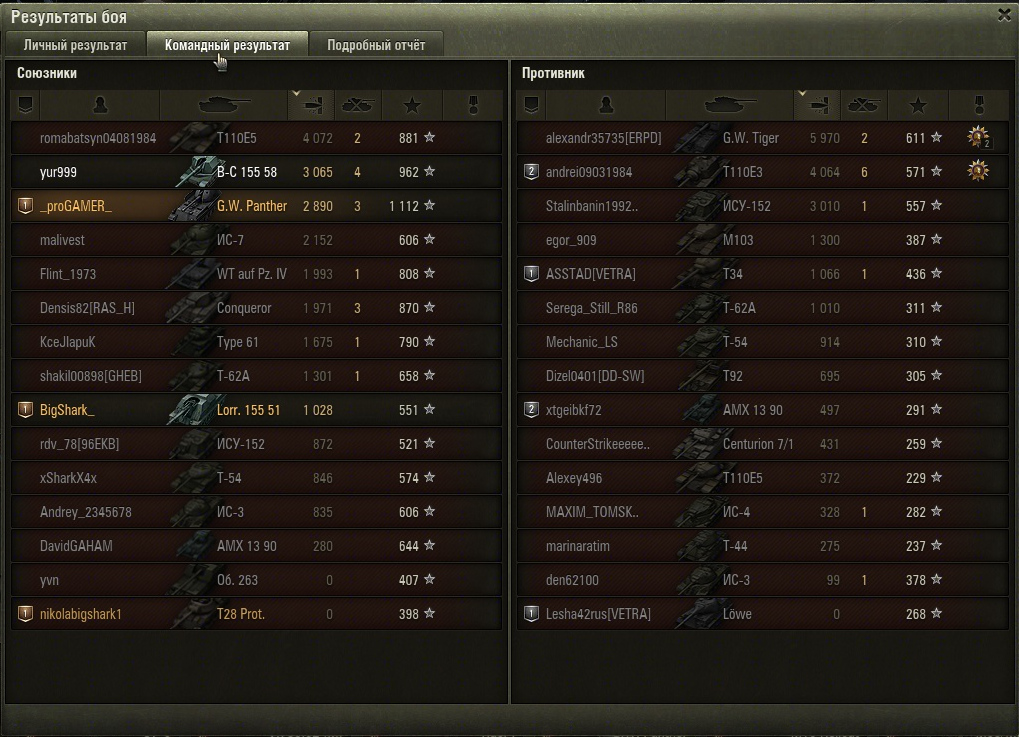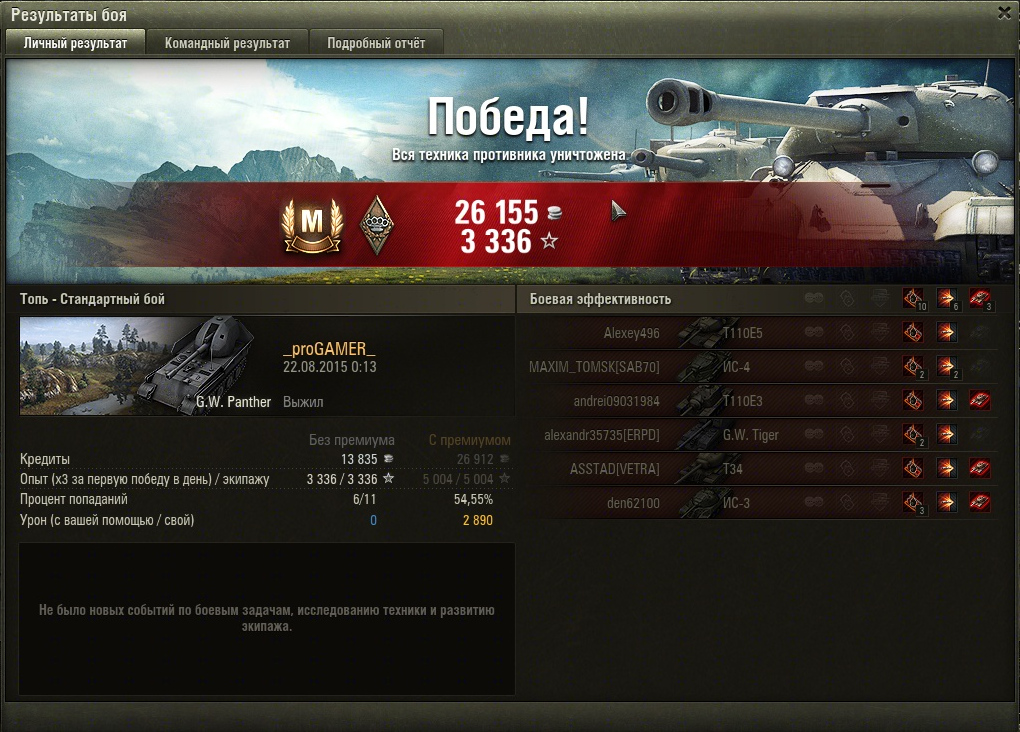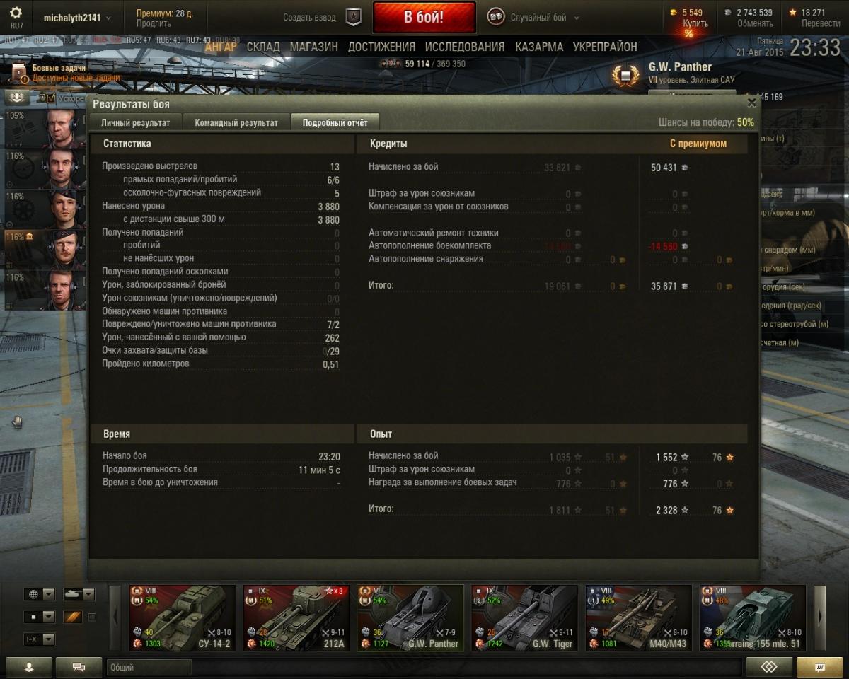 Тут решил потестить кумулятивы на пантере, думал будет по гуслям без урона проходить, но ВБР сжалился и проходили только пробития по 9м уровням, но от поражения это не спасло, потому что 3  девятых уровня со статкой 46 % оказались пацифисты и ушли в ангар с нулем урона. Жаль кумулей было ток 4. Итого 4200 урона :