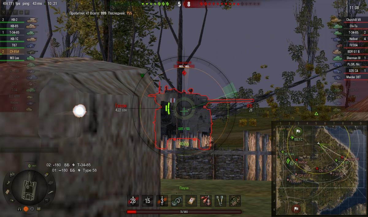 В ЦПП посоветуют удалить моды, сделать контрольные заезды без них и выловить такой же баг, если он есть и будет повторяться. Склоняюсь к мнению, что таки интернет и моды. Приметил, что много навороченных девайсов графически не очень точно отображают происходящее. Хотя бывает и смешное. На скрине (скрины с реплея, в бою заприметил, с реплея скринился и любовался), правда, не арта, и наводчик контужен, но эпичный интеллект снарядов. Причём, в этом бою, таких выстрелов по разным целям на разную дистанцию было несколько, и судя по результатам, у половины команды.