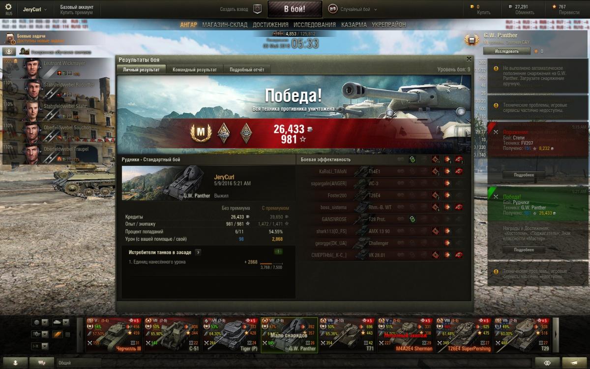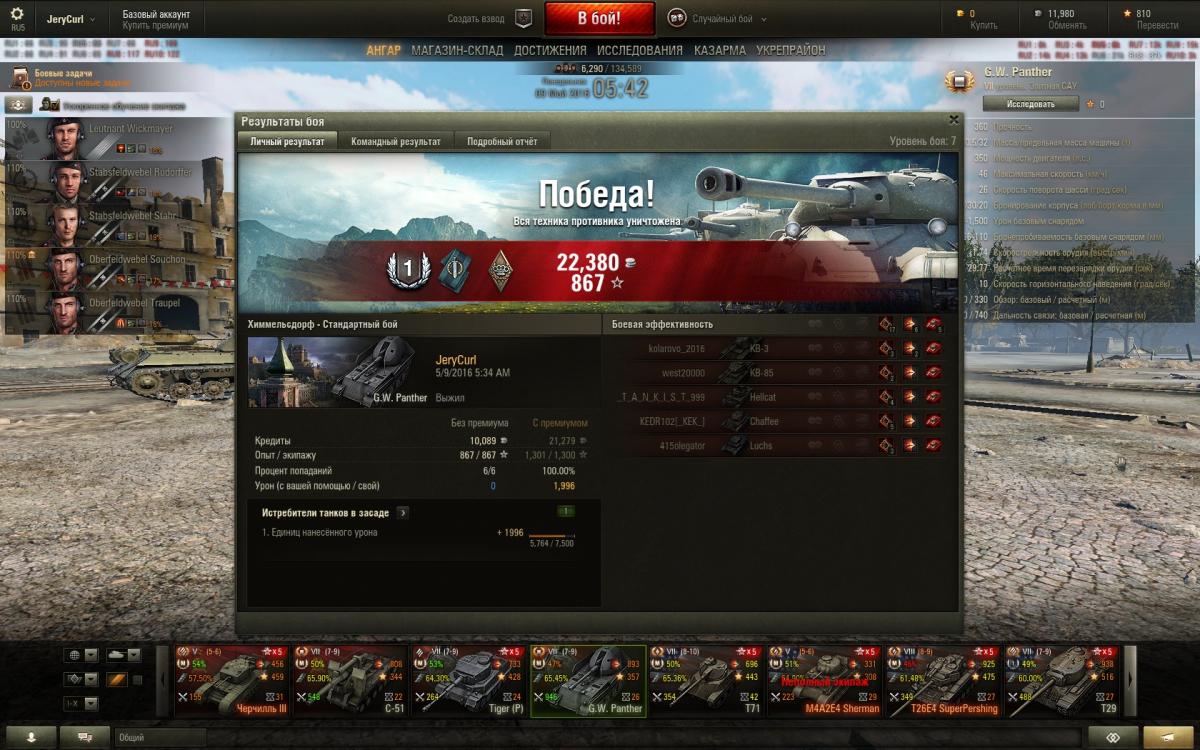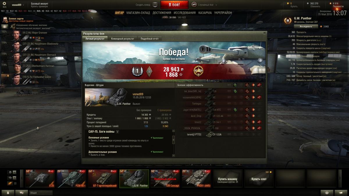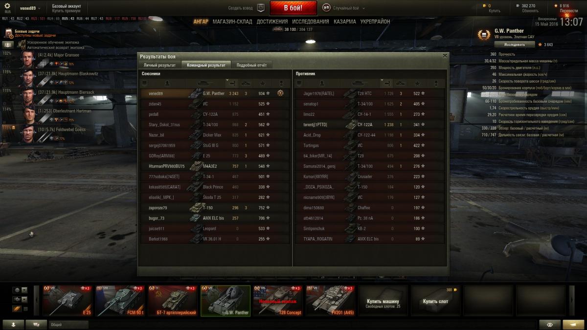 "Гв *** прошел и забыл, в жизни его не куплю. ГВ тигр как был до самого первого обновления, тогда он был на 8 уровне так и остался рандомным, типа попадет не попадет, тоже пройти и забить. Гве 100, при всех своих ттх проигрывает остальным артам 10 уровня, потому как все арты менялись а гве 100 как ввели в игру так и оставили в области сарая  со скоростью т95. Вот до 9.14 реально радовала гвп, если не верите можете по моей стате посмотреть, после выхода 9.14 не могу попасть даже в танк афк на базе, сегодня после одного такого боя, не выдержал и удалил клиент, туда ему и дорога.  Кстати про мастеров, я на гвп до 9.14 их брал через каждые 6 боев. Что касается ттх, они в этой игре ровным счетом ничего не значат, пусть про них флудят кто не чувствует разницы." --  Плюсую Вам!!!