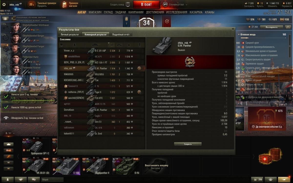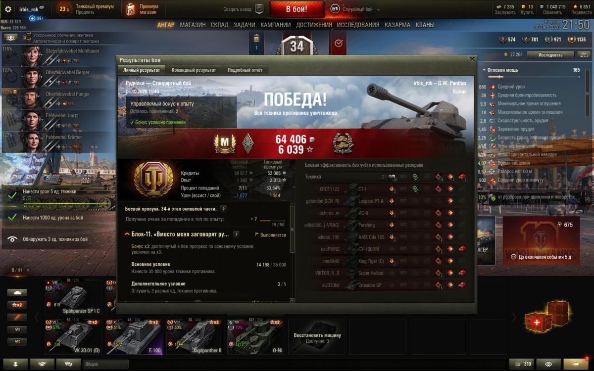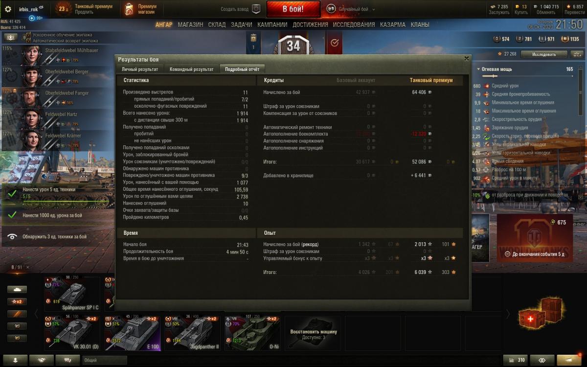 Просто нереальное везение. Семь попаданий из одиннадцати, два пробоя. Пять минут боя, при перезарядке в 21 секунду стрелял почти по КД, только когда добивали пришлось медлить.
