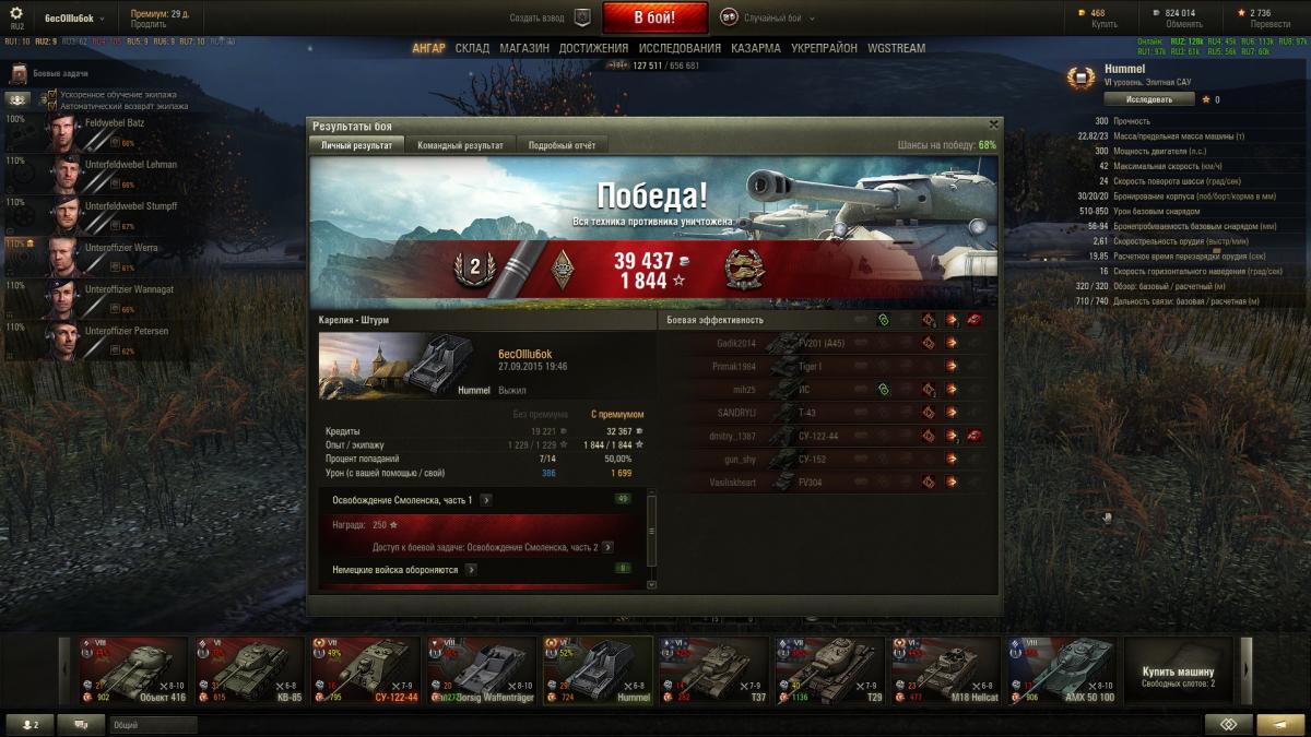 Сегодня поставил стоковую пушку, сразу дело на лад пошло, Хумель легче стал, стал лучше сводиться и попадать по движущимся мишеням. Лбз 13ю (15% дамага от команды набить) без взвода выполнил. Играю без голды.