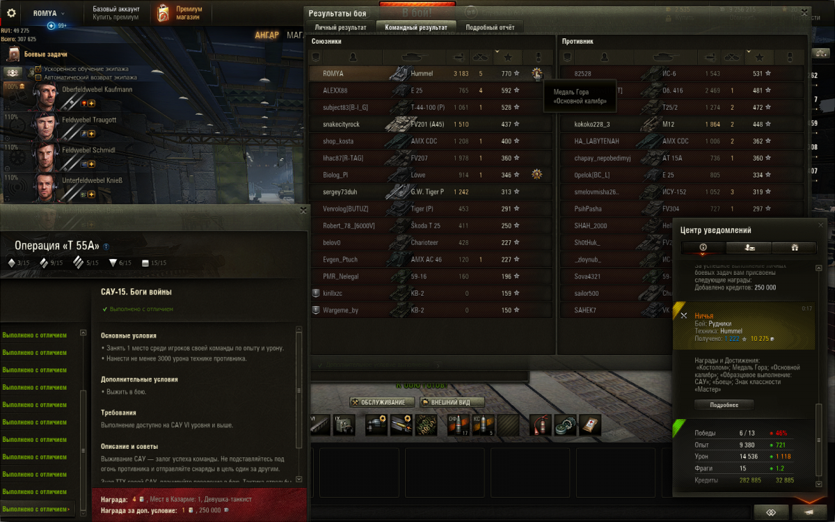 Hummel . карта: Карелия , «захват базы, команда атакует» ; 971 очков опыта для получения отметки «мастер» ; 12 выстрелов ( при 8 попаданиях ) – 2448 урона ( союзники 244 урона «по сбитой гусенице» ).