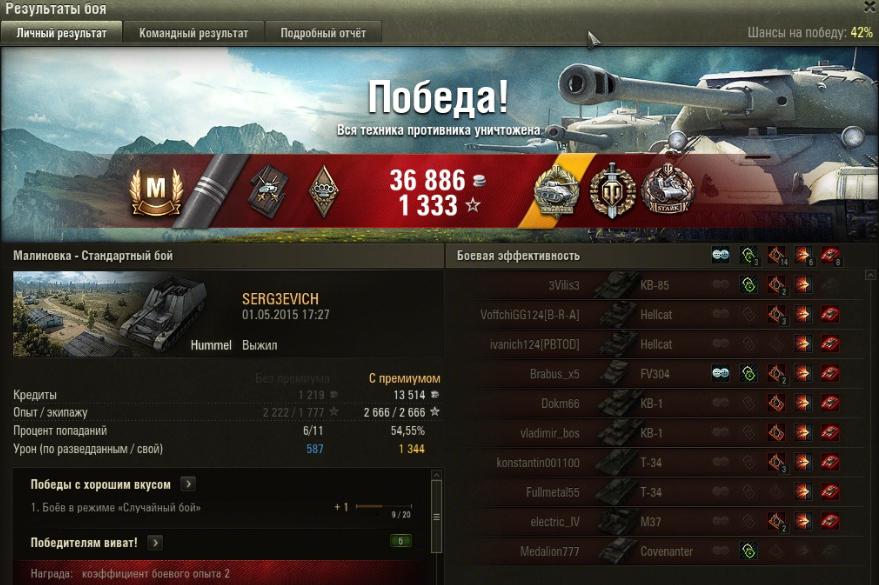 Катаю каждый день ( тошнит от хума). Уже больше 2000 боев. Вчера поучил отметку на ствол. Знакомый на лоре (8 левел) взял из милости во взвод. День катался по 9-10 левелам. Средний дамаг 1500. К концу дня получил полоску.