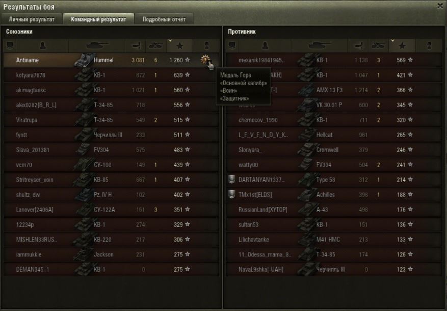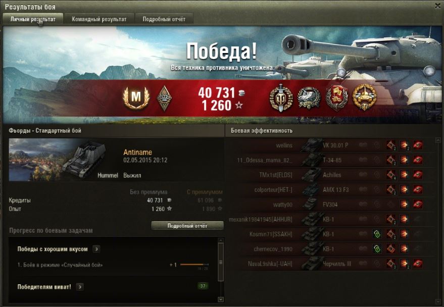 Только что взял первую отметку на ствол. Бой был в Химках. 1923 урона нанёс, основной калибр получил, четыре фрага сделал, но бой проиграли из-за клешнеруких. 35% было изначально. Первую классность получил. Если бы выиграли, был бы мастер. Такая первая победа сорвалась. Теперь на двух танках отметки есть. Ещё на Тигре.