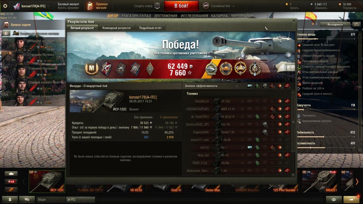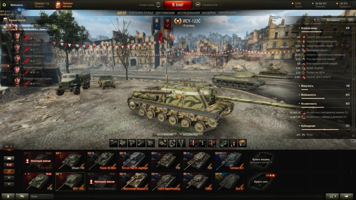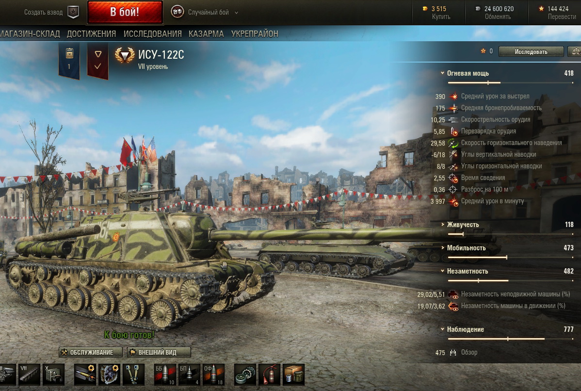 А по факту в лице ИСУ-122С мы имеем: почти читерский ДПМ, очень хорошую маскировку, весьма неплохой обзор и хорошую подвижность (особенно для тяжелой ПТ). Этого достаточно чтобы зачастую просто вытягивать бои. Ну, естественно, при прямых руках.