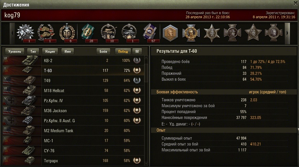 Посмотрел статистику для РУ сервера по Т-60,оказывается,за неделю средняя стата на этом танке выросла с 46% до почти 50% по серверу.Ещё немного и доиграемся до нерфа.