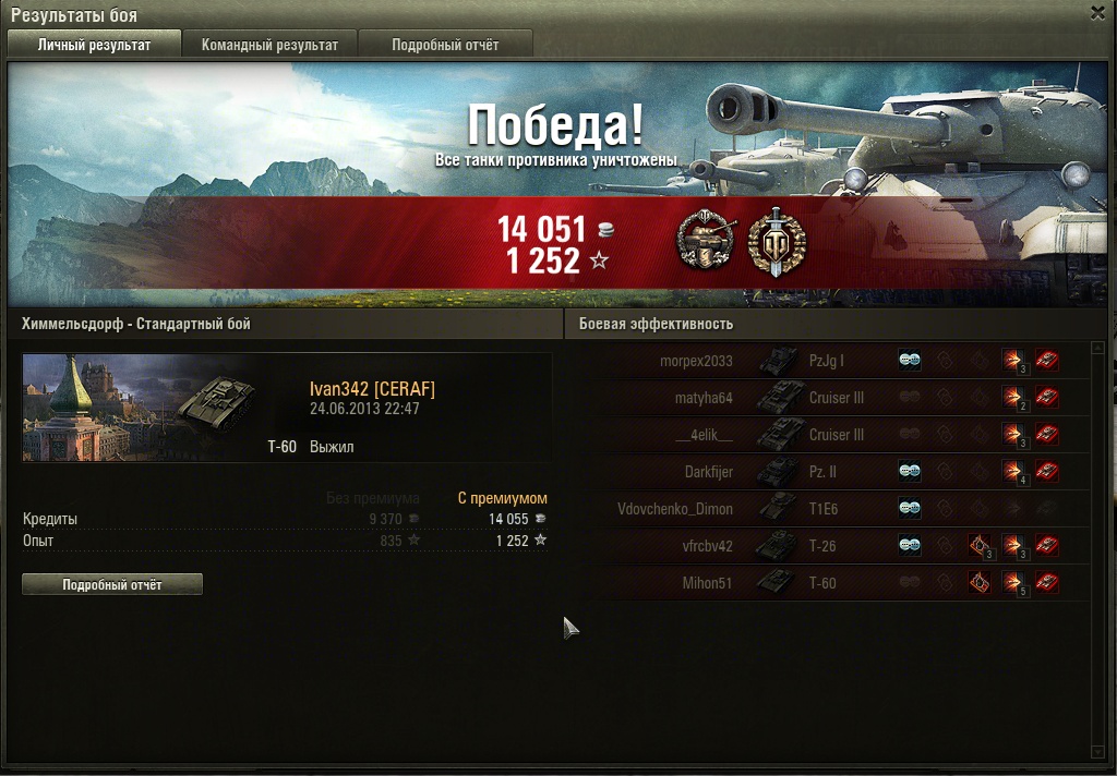 Приехал в "банан" а там напролом пошли:т-26,т-60,pzII pz jg I и cruiser III,а я один.Думал конец ан нет получилось всех пострелять и ещё убить летящий с горы cruiser III.ХП оставалось на 1 выстрел.