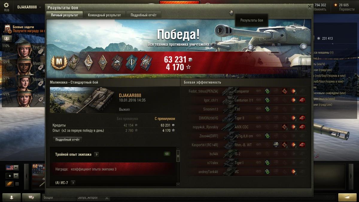 Как видно из скрина процент попаданий: 92% или 23 из 25. Это к вопросу о точности. На ближней и средней дистанции танк довольно точен. По ИС-7 стрелял с расстояния около 250 метров, например (3 из 4, так как один вошел в чито-борт).