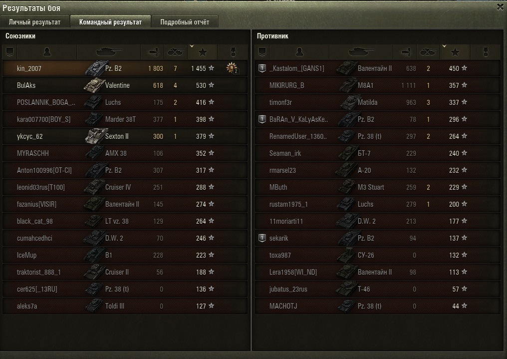 Купил по акции (как и достаточно значительное количество игроков, судя по рандому крайней недели) и начал катать. Ввиду "акта неслыханной щедрости от ВГ" в каждом бою В2 было по 4-5 штук в каждой команде вперемешку с матильдами. Из-за этого ажиотажа бои на Б2 в соло рандоме превратились в тягучее месиво. Сходились "богатыри" и молотили друг друга до посинения, а на остальных мочи уже не оставалось или их (соперников) уже и не оставалось вовсе. Умелые матильды и взвода из трех Б2 как лисы в курятнике куражились. Сей момент несколько смазывал остальные приятные ощущения от игры соло на танке, так как показать хороший (применительно к этому агрегату) результат в силу вышеуказанного не получалось достаточно долго. Что особо запомнилось, порой тебя один на один такой же Б2 разбирает на раз-два, причем ты выцеливаешь голдой уязвимые точки и у тебя сплошные рикошеты/непробития, а он, взяв тебя на автоприцел и качая качельки, лупит и у него сплошняком пробития на фул дамаг. Понятно, что ВБР и другие причиндалы, типа "бага реплея". И ещё его "небесное сияние", по субъективным ощущениям, он просто ёлка новогодняя вся в гирляндах. Да, не было камуфляжа и не прокачена маскировка у экипажа, но порой, бойцы в танке не дышали даже, а их все равно засекали. Ну а после ажиотажа удалось и мастера взять. http://wotreplays.ru/site/8942469#prohorovka-kin_2007-pz_kpfw_b2_740_f      А так конечно, аппарат знатный. Всем удачи.