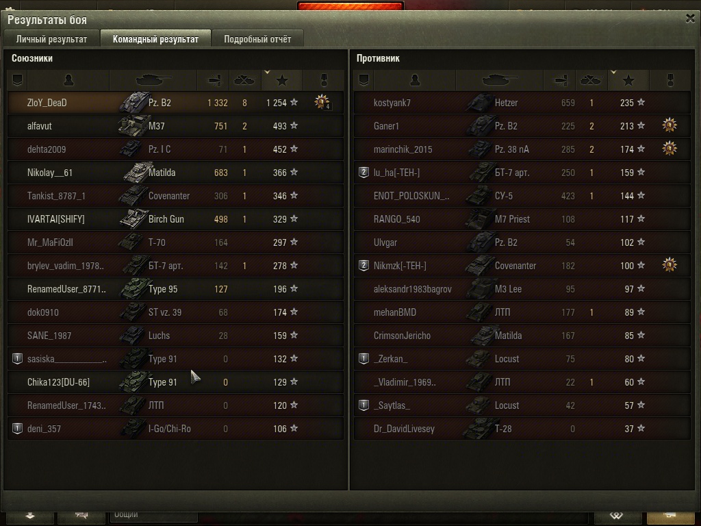 Мастер, у Вас средний дамаг на Капуте значительно больше, чем у предыдущего оратора Мурик_32 - но значительно меньший процент побед. Именно за счёт соло-игры в противовес взводной. Тут как раз приходится выбирать, % или дамаг. Или компромисс - взвод атакует два-три разных направления. Нет фокуса, но ценой минимального проседания % сильно растёт урон за бой у каждого совзводного. Насчёт резкого возрастания количества в боях - оно сейчас сильно чувствуется ночью, когда часто играются бои 7-на-7, 10-на-10, т.е. неполные составы. Так что пока ночью лично я выкатывать не буду и не рекомендую, только сильным взводом из 3-х шт. Днём полегче, на фоне большого онлайна лишние 10-20к свежекупленных танков - капля в море.