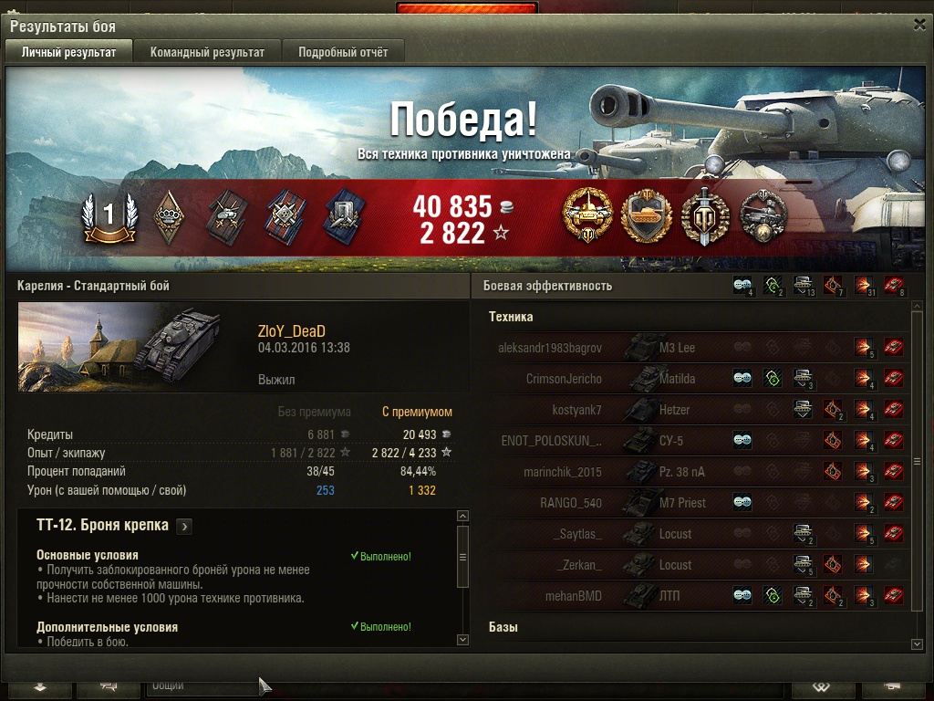 КУПИЛ ВЧЕРА,ВЕЧЕРОМ ВЫКАТИЛ,СОБРАЛИСЬ В ДИНАМИЧЕСКИЙ ВЗВОД С КАПУТАМИ,ОТКАТАЛИ 30 БОЁВ-28 ПОБЕД,НА ДАННЫЙ МОМЕНТ ЭТОТ ТАНК РЕАЛЬНО СТОИТ СВОИХ ДЕНЕГ,800 РУБ. ЗА МЕСЯЦ ПРЕМА,СЛОТ И ЭТОТ ТАНК-ЭТО ПРОСТО ПОДАРОК...