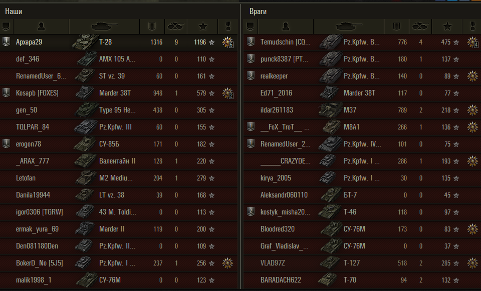 Значит посмотрел я тот реплей. После вопроса в общий чат "Куда тут на ТТ ?" всё стало вполне очевидно, хотя если судить по статистике, вроде бы похоже просто на вброс. Однако действия В2 (на сколько мне удалось их увидеть) и конечный результат, говорят об обратном. Хотя вполне может быть просто неудачный бой, либо просто опустили руки, увидев взвод Т-28, СУ-85Б, Мардера 38Т. Где помер 3-й В2 я даже не понял, а остальных 2-х в принципе команда расковыряла. Позиция, на которой находился автор реплея была довольно дерзкая, учитывая, что стояли Вы там почти весь бой и вели огонь.