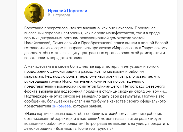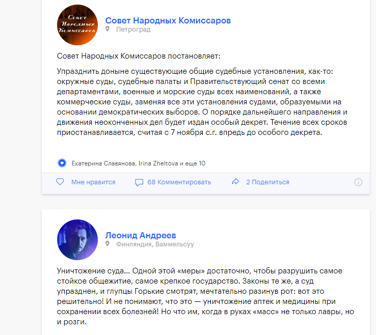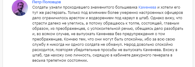 RenamedUser_57722573 Опубликовано: 17 июля, 2022 Игроки 1 623 публикации 309 боёв Поделиться Опубликовано: 17 июля, 2022 17 июл 2022 - 15:16 пользователь HABO3_HA_nRTKAX_2018 сказал: причём тут троллинг? если образованный человек не может прочитать написанное в постановлении по-русски что дореволюционные царские суды не просто упраздняются а заменяются на новые выборные -это либо неумение читать либо нежелание понять написанное..не понимаю что в этом нелогично-новая власть не может доверять старой судебной системе и меняет её на новую..подобное в истории бывало не раз и не два при смене правительств или монархов-но только действия большевиков почему-то вызывают негативную реакцию .. Так в то и дело, что человек - современник событий и он видел, как большевики захватывали власть, а, как известно, как придут к власти, так править и будут. В любом случае, он предвидел ситуацию на много лет вперед - у народа пропал справедливый суд лет на пятьдесят после захвата власти большевиками. Воспоминания современников за 18 июля 1917 года: все даже знали цену, за которую большевики готовили переворот и июлбское восстание большевиков потерпело поражение. Ссылка на комментарий