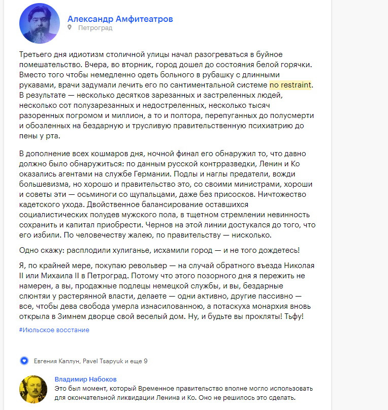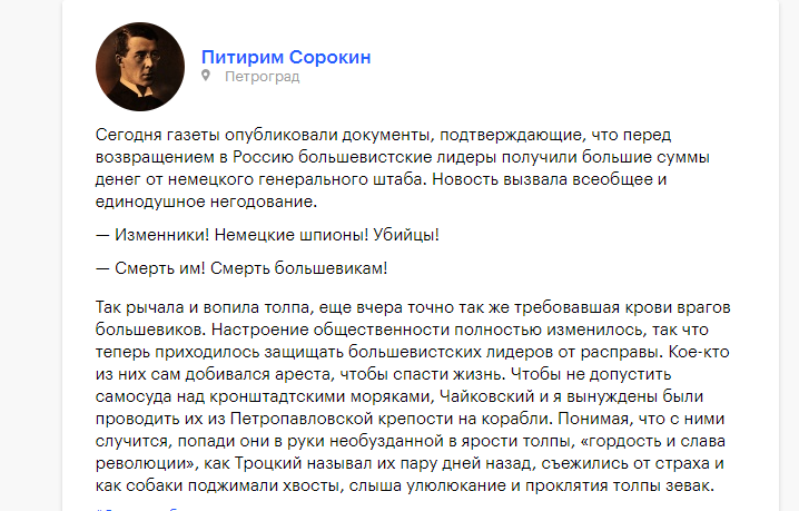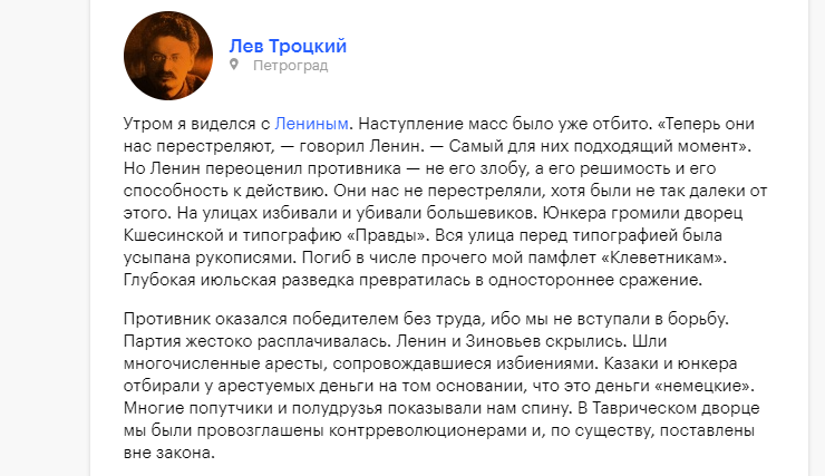 RenamedUser_57722573 Опубликовано: 18 июля, 2022 Игроки 1 623 публикации 309 боёв Поделиться Опубликовано: 18 июля, 2022 18 июля 1917 года народ хотел уничтожить предателей и немецких агентов:Большевики, спасая свою жизнь после бегства Ленина, сами просили народ разойтись по домам.Даже Троцкий говорил о панике Ленина и нежелании народа следовать за большевиками: Ссылка на комментарий