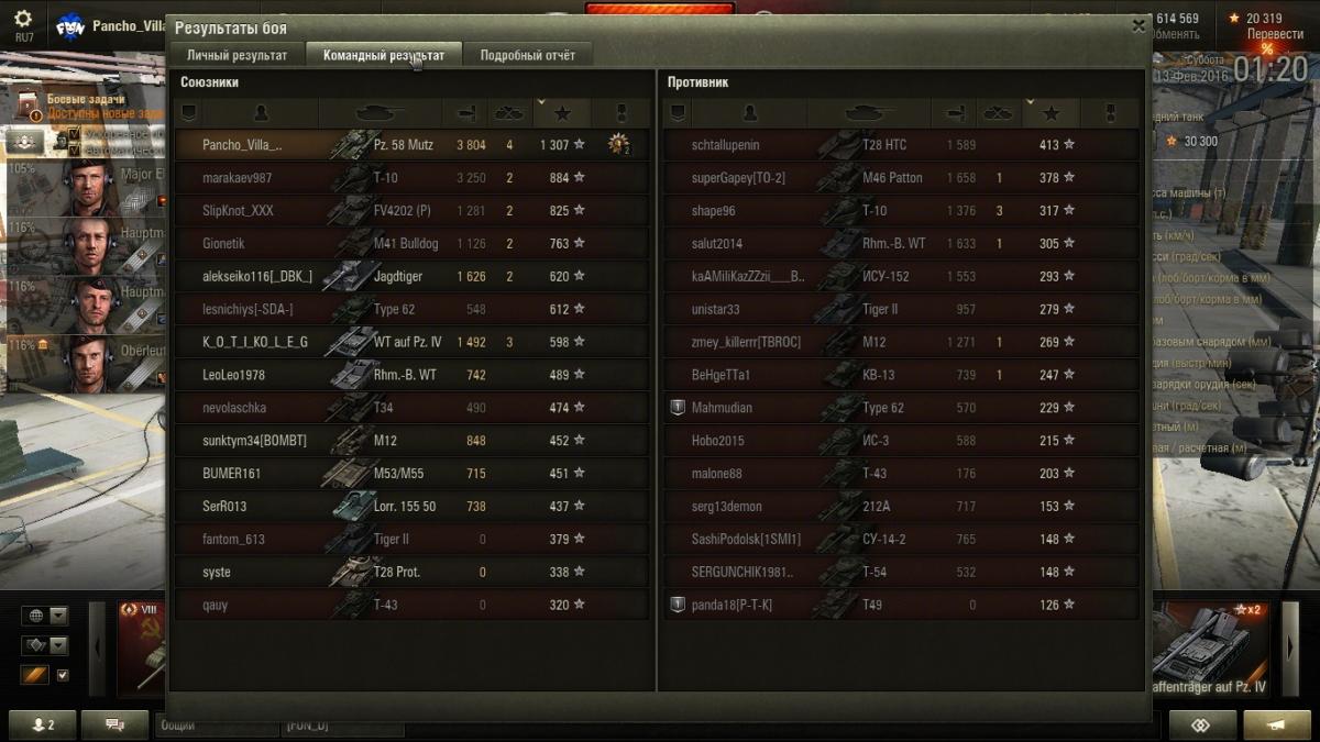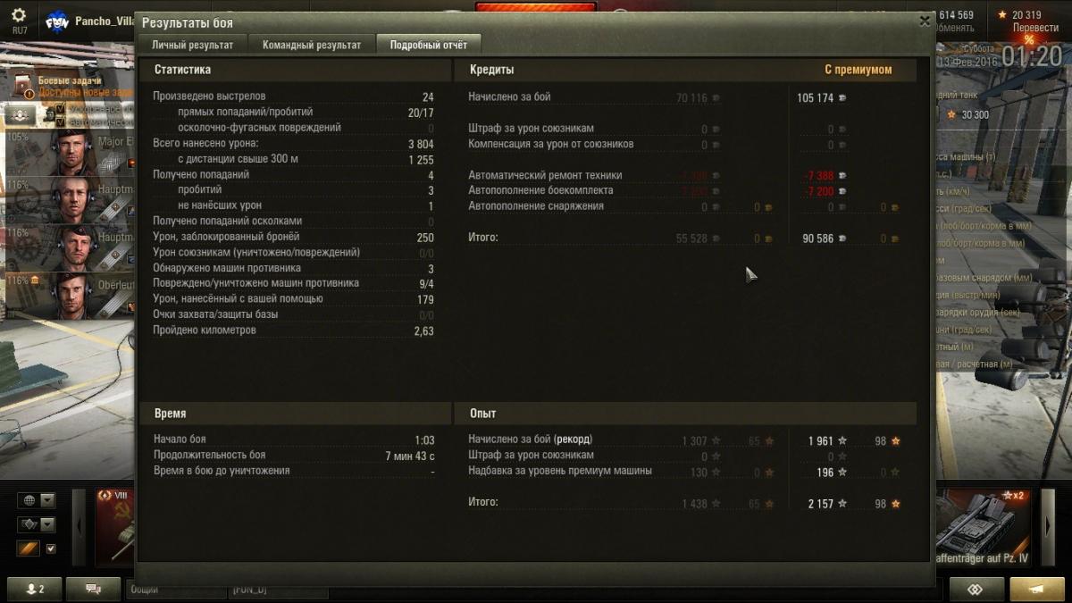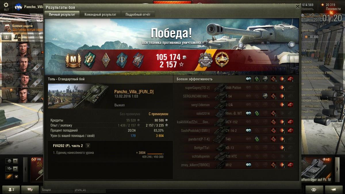 maloyd7 Опубликовано: 12 февраля, 2016 Игроки 196 публикаций 26 014 боёв Поделиться Опубликовано: 12 февраля, 2016 За 20 боев вот такой результат, последние 2 боя были с 999 пингом(по нулям настрелял, на даче с 3G играю)... А так ср. урон был в районе 1800-1900Танк едет не очень то и резво, Type59 едет резвее, фармит тоже средне... Но играть приятно, даже очень.На дальние расстояния стреляет плохо, лучше заряжать голду на даль. Справа находится БК, иногда критуется, но не часто.Иногда танкует, Е25 например пробивает ББхой в 1 из 3 попаданий, иногда танкует 8-10 (но не часто)Короче, танк очень даже ниче такойДля прокачки экипажа самое то, сам взял для Leo1http://savepic.ru/8606352.png Ссылка на комментарий Поделиться на других сайтах Другие способы поделиться...