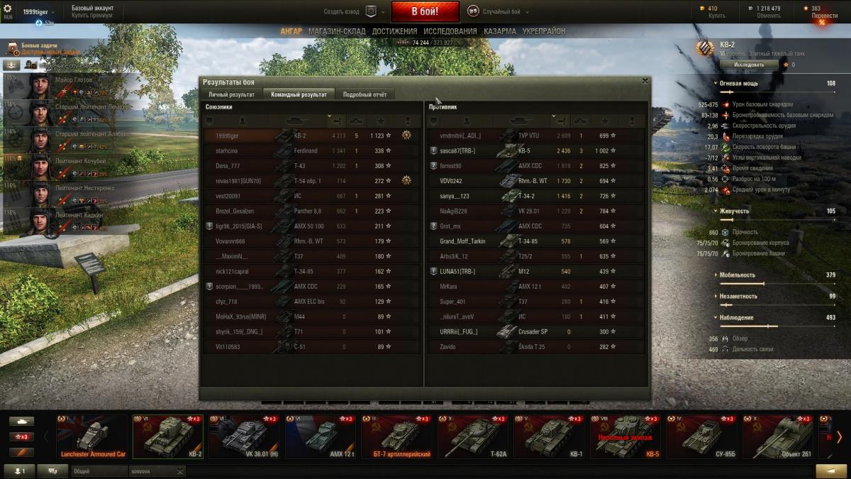 Опять обновой балансер поломали? Почти год не играл, а тут выкатил. Катали взводом 2 КВ_2, и что характерно- только 1 бой с 8-ми! Остальное- в топе. Ну и 7-к чуток. И 2-й раз в игре услышал от фугаса "непробил". 1-й раз хоть от КВ-5. А тут- от Тигра. Был немало удивлён. И почему-то после обновы снаряды не меняются местами. (Вожу на всякий 4 голдовых- так по первости они автоматом заряжались первыми).